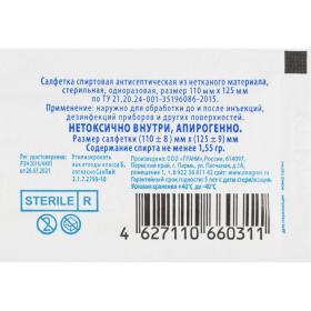 Салфетка изготовлена из нетканого гидросплетённого материала спанлейс плотностью 40 г/м², напоминающего текстиль. Благодаря пропитке спиртом (70% этилового спирта), она подходит для дезинфекционной обработки рук и кожных покровов в стационаре и в быту, а также для подготовки операционного поля и мест проколов, обработки кожи до и после постановки инъекций, заборов крови, обработки инструментов и различных поверхностей. Время выдержки после окончания обработки кожи инъекционного поля, кожных покровов перед прививками, а также частичной санитарной обработки кожных покровов — 30 секунд или до полного высыхания.<br> <br> Размер салфетки — 110×125 мм. Упаковка салфетки легко вскрывается без использования ножниц. Многослойный упаковочный материал обеспечивает сохранение свойств продукта в течение всего срока годности. Срок годности составляет 5 лет с даты изготовления. Упакованы согласно ГОСТ ISO 11607-1-2018. Выпуск по ТУ 21.20.24-001-35196086-2015.<br> <br> На индивидуальной упаковке салфетки в обязательном порядке должны быть нанесены: информация о пропитывающем составе (торговое наименование спиртового раствора в процентном содержании), а также маркировочный знак стерилизации. В каждой салфетке содержится не менее 1.55 г раствора спирта.<br> <br> Внешний вид и/или характеристики товара могут быть изменены производителем в соответствии с производственным процессом.