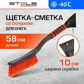Щётка-скребок Stels 58 см (55303)<br><br>Щётка-смётка для снега со скребком Stels 55303 длиной 580 мм используется для чистки автомобиля в зимний период. Она не царапает лакокрасочное покрытие, поскольку её щетина имеет распушённые кончики. Щётка со скребком пригодится автолюбителям.<br><br>Преимущества<br>• Щётка изготовлена из морозоустойчивого пластика, поэтому прослужит долго.<br>• Пластиковый скребок шириной 100 мм быстро очищает стекла.<br>• Рукоятка щётки-смётки изогнута, что облегчает очистку труднодоступных мест.<br>• На рукоятке имеется мягкая накладка, поэтому её комфортно держать без перчаток.
