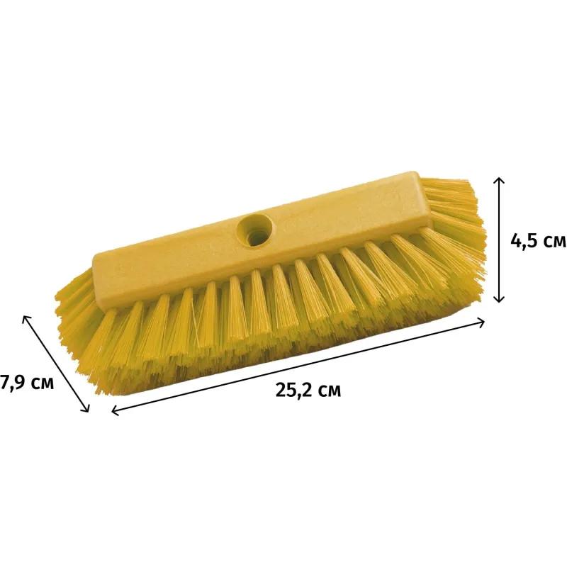 <b>Щётка разноуровневая для пола и стен Haccper 25.2 см жёсткая без ручки (4202Y/864201Y)</b><br><br>Изогнутое основание делает щётку универсальным и удобным инструментом для мытья стен, пола, в том числе под оборудованием. Боковые выступы упрощают мойку плинтусов и труднодоступных мест. Подходит для мытья пола и стен.<br>Материал корпуса: полипропилен.<br>Тип щетины: жёсткий.<br>Щетина выполнена из полипропилена, расположена под углом относительно основания и является разноуровневой. <br>Количество рядов щетины − 11.<br>Крепление рукоятки выполнено из полипропилена в виде резьбы. Диаметр резьбы 15 мм.<br>Рукоятка в комплект не входит.<br>Ширина рабочей части: 25.2 см. <br>Соответствует требованиям ХАССП.<br>Температурный режим использования от минус 40°С до плюс 80°С.<br>Допустимый режим автоклавирования до плюс 124°С.