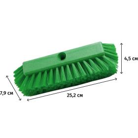 <b>Щётка разноуровневая для пола и стен Haccper 25.2 см жёсткая без ручки (4202G/864201G)</b><br><br>Изогнутое основание делает щётку универсальным и удобным инструментом для мытья стен, пола, в том числе под оборудованием. Боковые выступы упрощают мойку плинтусов и труднодоступных мест. Подходит для мытья пола и стен.<br>Материал корпуса: полипропилен.<br>Тип щетины: жёсткий.<br>Щетина выполнена из полипропилена, расположена под углом относительно основания и является разноуровневой. <br>Количество рядов щетины − 11.<br>Крепление рукоятки выполнено из полипропилена в виде резьбы. Диаметр резьбы 15 мм.<br>Рукоятка в комплект не входит.<br>Ширина рабочей части: 25.2 см. <br>Соответствует требованиям ХАССП.<br>Температурный режим использования от минус 40°С до плюс 80°С.<br>Допустимый режим автоклавирования до плюс 124°С.