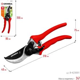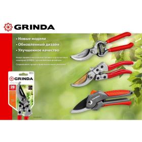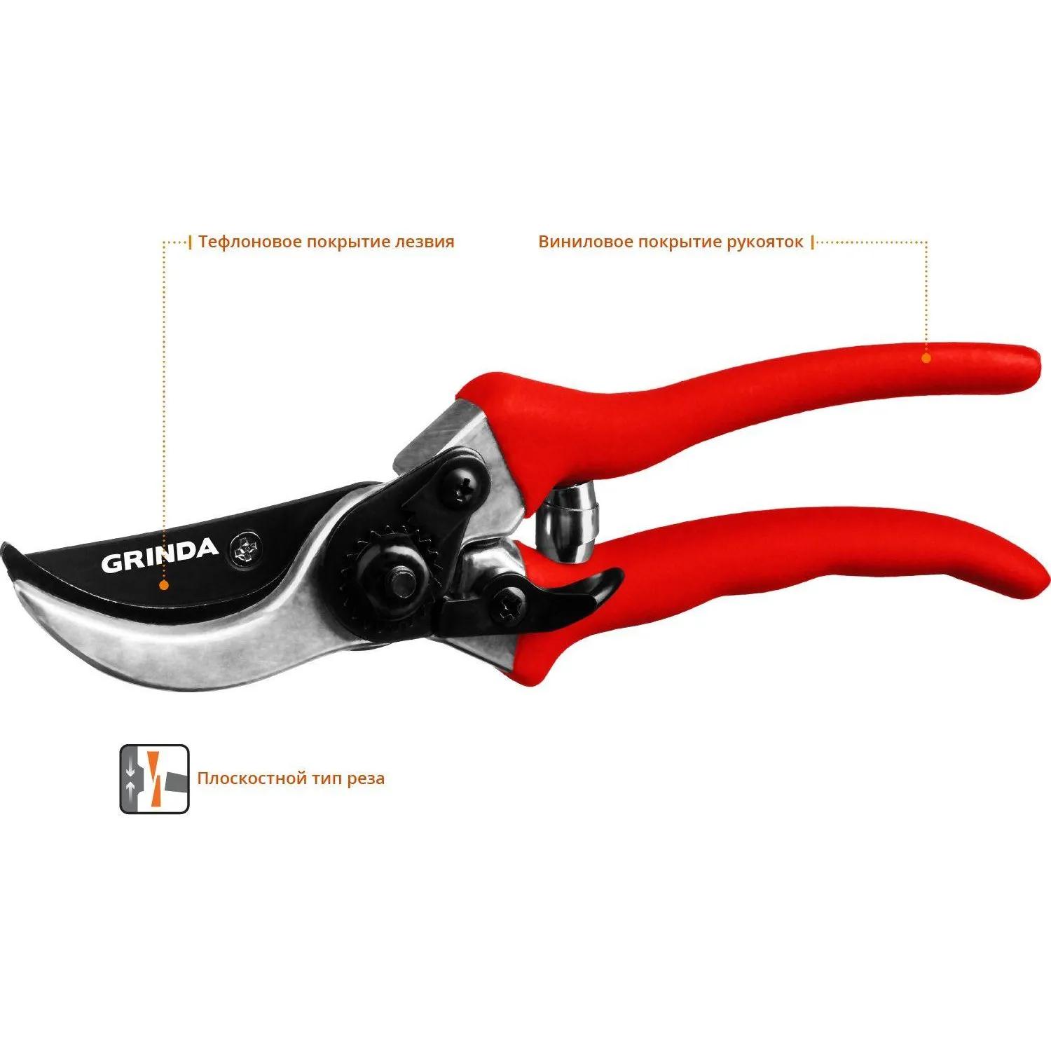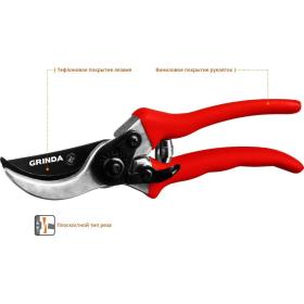 Все секаторы Grinda являются прочными, долговечными и удобными изделиями, обеспечивая комфортный и лёгкий рез. Они выполнены из высококачественных материалов гарантирующих долгий срок эксплуатации.<br><br>Применение<br>Для обрезки веток и стеблей растений.<br><br>Преимущества<br>• Тефлоновое покрытие лезвия.<br>• Алюминиевые ручки с виниловым покрытием.<br><br>Внешний вид и/или характеристики товара могут быть изменены производителем в соответствии с производственным процессом.