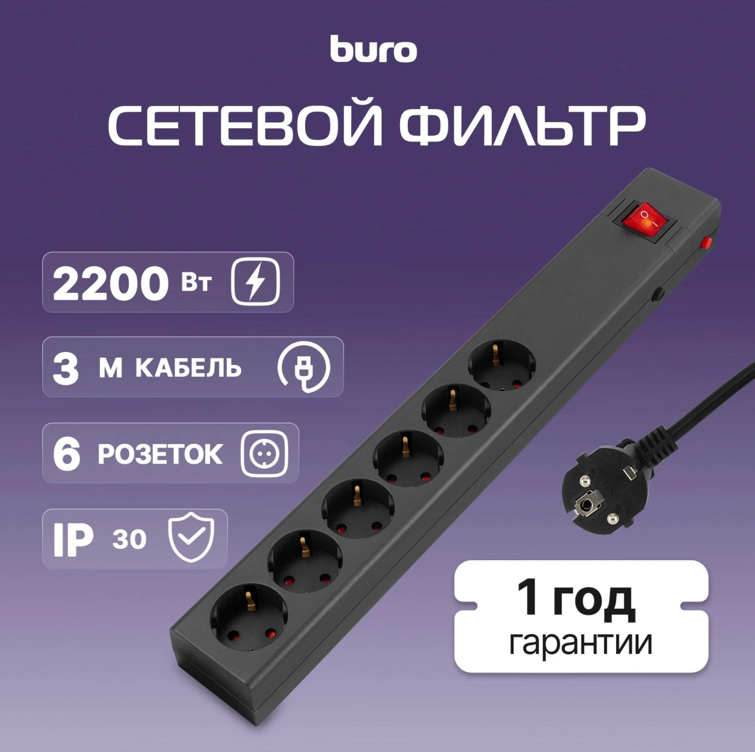 Сетевой фильтр Buro 600SE-3-B 3м (6 розеток) черный (коробка)