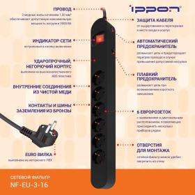 Сетевой фильтр Ippon NF-EU-3-16 3м (6 розеток) черный (коробка) / 4dealer.ru