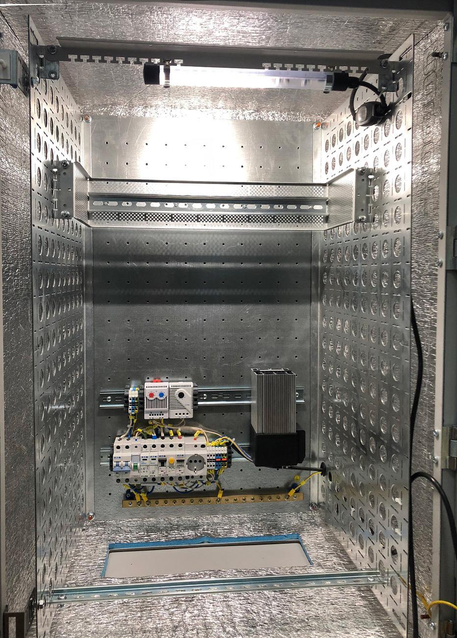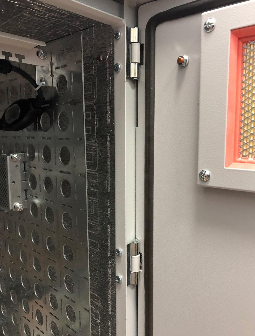 При изготовлении шкафов ШТВ-НН применяется нержавеющая сталь марки AISI 430. Шкафы дополнительно покрываются слоем полимерно-порошковой краски. Укомплектованные шкафы серии ШТВ-НН представляют собой готовое решение с системой контроля микроклимата, которая поддерживает заданную температуру и влажность в заданных параметрах круглый год. Комплектация Т1 имеет нагрев и охлаждение. Изделие в климатическом исполнении У1 по ГОСТ 15150–69 предназначено для уличной эксплуатации при температуре от минус 50 до 45 °С и относительной влажности воздуха не более 80 % при 20 °С. Шкаф крепится на стену при помощи четырёх уголков (анкеры не входят в комплект поставки), при необходимости можно применить крепление на столб (не входит в комплект поставки). В основании шкафа предусмотрены съёмные заглушки для ввода кабелей. Конструкция заглушек предполагает разное количество и диаметр отверстий для установки кабельных вводов по желанию заказчика. (В комплект изделия входит один кабельный ввод для подключения питания шкафа). Для крепления на столб необходимо докупить комплект крепления на столб. Питание изделия осуществляется от внешней электрической сети напряжением 220 В переменного тока частотой 50 Гц. Изделие имеет степень защиты от поражения электрическим током класса I по ГОСТ IEC 61140-2012 и соответствует ГОСТ 12.2.027.0-75. Допустимая распределённая статическая нагрузка до 150 кг. Корпус шкафов серии ШТВ-НН имеет металлическую сварную конструкцию, внутри покрыт слоем утеплителя с фольгированным покрытием, что улучшает термоизоляцию и уменьшает теплопотери через стенки шкафа. В комплект шкафа входят задняя оцинкованная панель и комплект вертикальных юнитовых панелей. Двери шкафов серии ШТВ-НН имеют перфорацию, которая обеспечивает вентиляцию установленного в них оборудования, но при этом исключает прямой доступ в полость шкафа и попадание в него инородных предметов. В дверь встроена система вентиляции, состоящая из модуля вентиляторного и фильтра. Максимальный угол открытия двери шкафа 120°. На кронштейне, расположенном на верхней петле двери, находится датчик открытия дверей.Cтепени защиты, обеспечиваемой оболочками от наружного механического удара - IK 10. Перечень установленного оборудования: Вентилятор Нагреватель полупроводниковый Разрядник перенапряжения Индикатор напряжения Гигростат Термостат Выключатель дифференциальный защитный Выключатель автоматический Датчик открытия двери Розетка на DIN-рейку Шина заземления