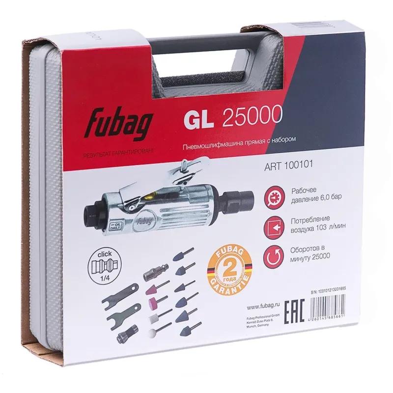 Шлифмашина прямая пневматическая Fubag GL25000 (100101)<br><br>Прямая пневмошлифмашина предназначена для шлифовки различных поверхностей. Корпус инструмента выполнен из металла, что обеспечивает ему отличную устойчивость к механическим повреждениям. В комплекте с инструментом поставляется набор оснастки, что значительно расширяет спектр рабочих возможностей.<br><br>Комплектация<br>• 2 гаечных ключа;<br>• 5 камней 3 мм;<br>• 5 камней 6 мм;<br>• Цанга 3 мм;<br>• Цанга 6 мм;<br>• Штуцер;<br>• Упаковка.<br><br>Внешний вид и/или характеристики товара могут быть изменены производителем в соответствии с производственным процессом.