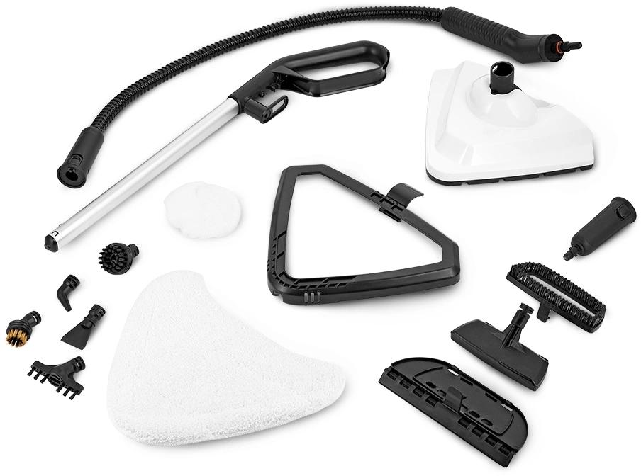| Комплектация | тряпка для пола, рамка для ковра, паровой шланг, струйная насадка, насадка для отпаривания с резиновым скребком, тряпка для отпаривания, скребок для стекла с резиновой вставкой, ворсовая щетка, угловая насадка, скребок, плоская нейлоновая щетка, круглая нейлоновая щетка, круглая латунная щетка |