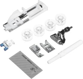 | Конструктивные особенности | быстросъемная лапка, дополнительный подъем лапки, отсек для хранения принадлежностей, рукавная платформа, ручка для переноски |
