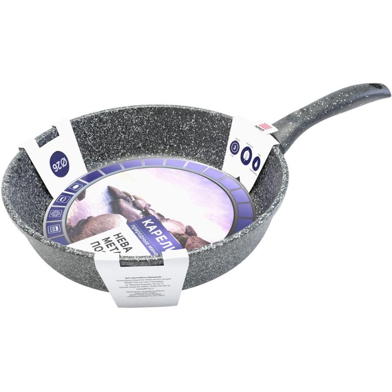 Сковорода антипригарная литая 26 см Карелия ТМ НМП. <br>Дизайн сковород линии ’Карелия’ выполнен в светло-сером и белом цветах с добавлением темных вкраплений. Это подчеркивает яркие цвета привычных нам продуктов и добавляет светлых оттенков в интерьер кухни. <br>Покрытие устойчиво к царапинам и другим механическим повреждениям, что гарантирует долгую эксплуатацию и сохранение антипригарных свойств сковороды. <br>Изделие подходит для всех типов плит, кроме индукционных.