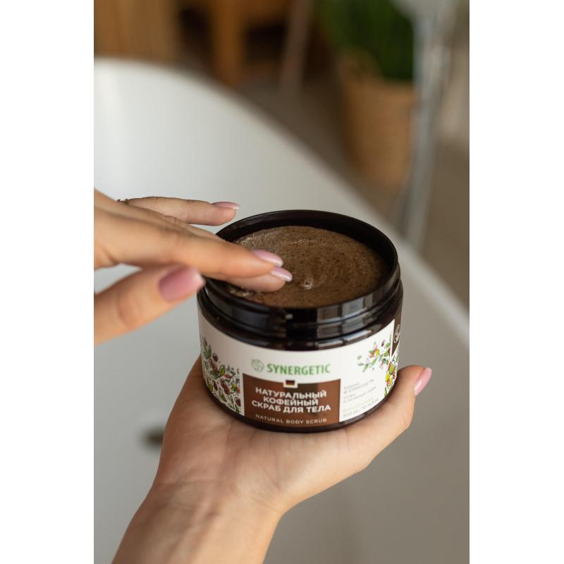 Скраб для тела Synergetic тонус и упругость "Кофе и зеленый лайм" кофейный натуральный 300 мл. Назначение: Натуральный кофейный скраб для тела Synergetic тонус и упругость, кофе и зеленый лайм - это эффективное средство для ухода за кожей, более чем на 99% состоящее из натуральных компонентов. Скраб деликатно отшелушивает и очищает кожу. Масло кокоса в сочетании с молотым кофе интенсивно тонизирует и придает упругость, а масло карите питает и увлажняет, делая кожу гладкой и бархатистой. Масло миндаля и экстракт лайма интенсивно увлажняют нежную кожу, придавая мягкость и упругость. Гипоаллергенная парфюмерная композиция разработана в швейцарском доме Givaudan. Аромат натурального кофейного скраба для тела Synergetic с нотами лайма, кофе, ореха и карамели оставляет на коже изысканный аромат. Натуральный скраб не содержит SLS, SLES, парабенов, силиконов, минеральных масел и красителей, а также компонентов животного происхождения, не тестируется на животных и сертифицирован британской организацией The Vegan Society. Способ применения: нанести скраб на влажную кожу, помассировать и тщательно смыть водой. Возможно отсекание масла и незначительное изменение цвета скраба, не влияющие на его качество и свойства. Меры предосторожности: при попадании в глаза, промыть водой. Только для наружного применения. Оберегать от детей и животных. Хранить отдельно от еды. Состав: Sucrose (сахар), Glycerinx (увлажняющий компонент растительного происхождения), Cetearyl Alcoholx (натуральный загуститель), Butyrospermum Parkii Butterx (масло карите), Coffea Arabica Seed Powder (молотый кофе), Aqua (вода), Citrus Aurantifolia Juice (экстракт лайма), Sweet Almond Oil Polyglyceryl-4 Estersx (масло миндаля), Cocos Nucifera Fruit Oilx (масло кокоса), Bisabololx (растительный экстракт), Zingiber Officinale (Ginger) Root Extractx (экстракт имбиря), Cocamidopropyl Betainex (мягкий ПАВ из кокосового масла), Parfum (парфюмерная композиция на основе эфирных масел), Potassium Sorbate (природный консервант). x ECOCERT approval. Условия хранения: хранить при температуре от +5 до +25 °С вдали от нагревательных приборов и огня. Не допускается хранение под непосредственным воздействием солнечного света Срок годности: 36 месяца с даты производства при соблюдении условий хранения.