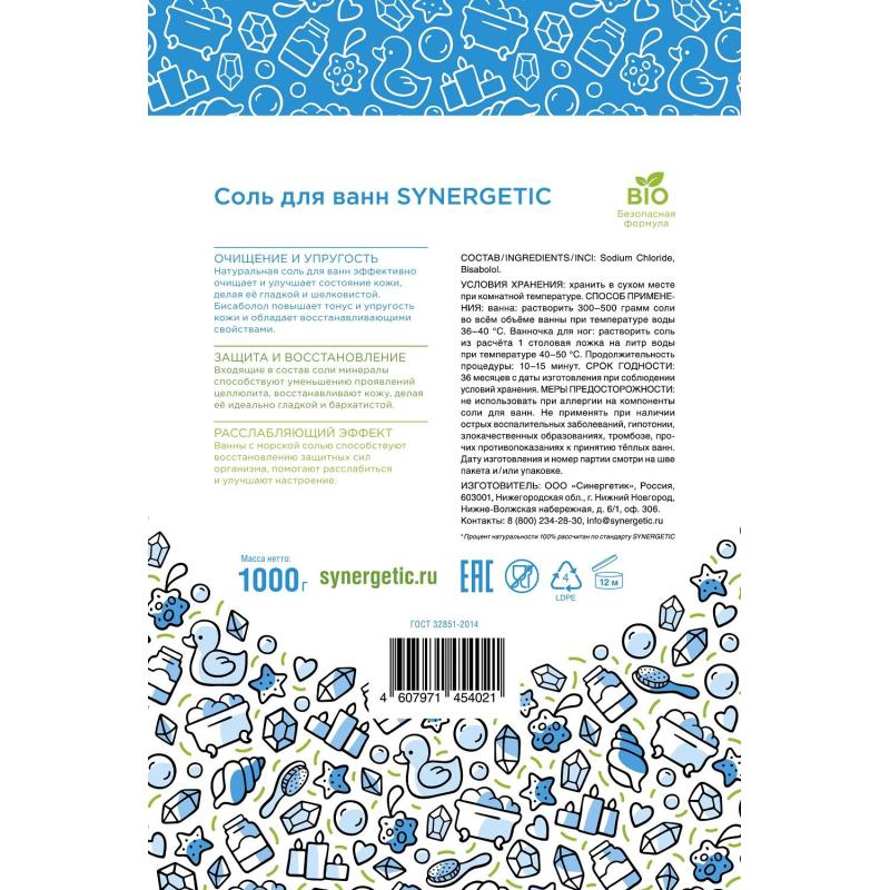 Благодаря отсутствию химической и высокотемпературной обработки все они сохраняются в неизменном природном виде. Теплая ванна с морской солью SYNERGETIC - это прекрасный способ восстановить силы и насытить организм полезными веществами.