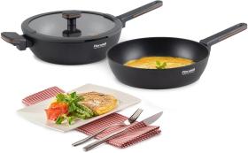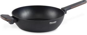 Особенности Материал: высококачественный кованный алюминий. Стильные бакелитовые ручки с силиконовыми вставками удобны в использовании. Плоская крышка сотейника и вока из термостойкого стекла с отверстием для выпуска пара и широким силиконовым ободком против сколов и трещин.