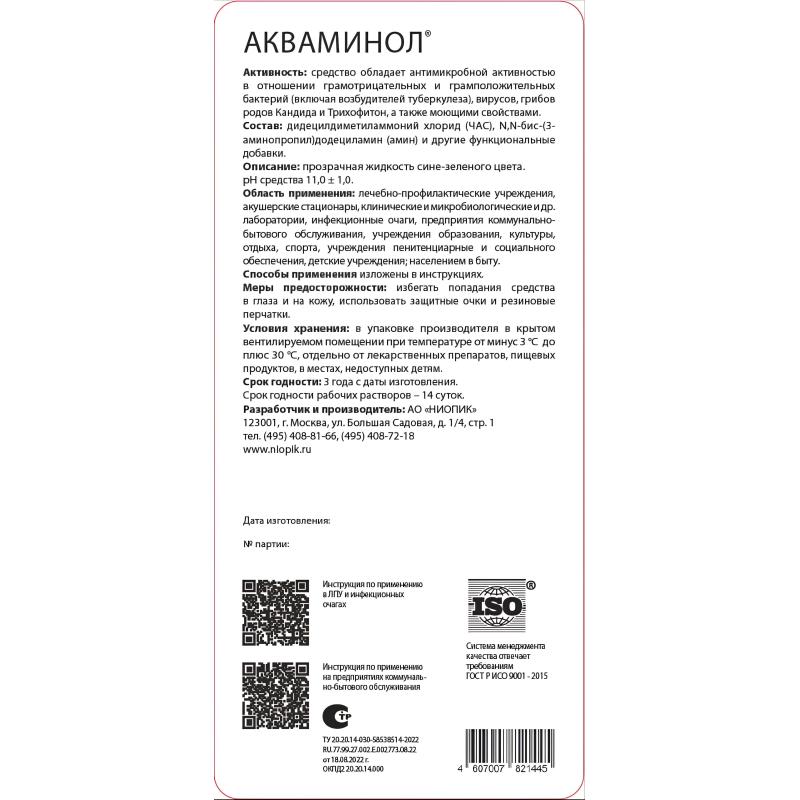 Концентрат. Универсальное безальдегидное дезинфицирующее средство с моющими свойствами.Химический состав дидецилдиметиламмоний хлорид - 4,0%, N,N–бис(3-аминопропил)додециламин - 4,0%, неионогенные поверхностно-активные вещества, краситель, отдушка