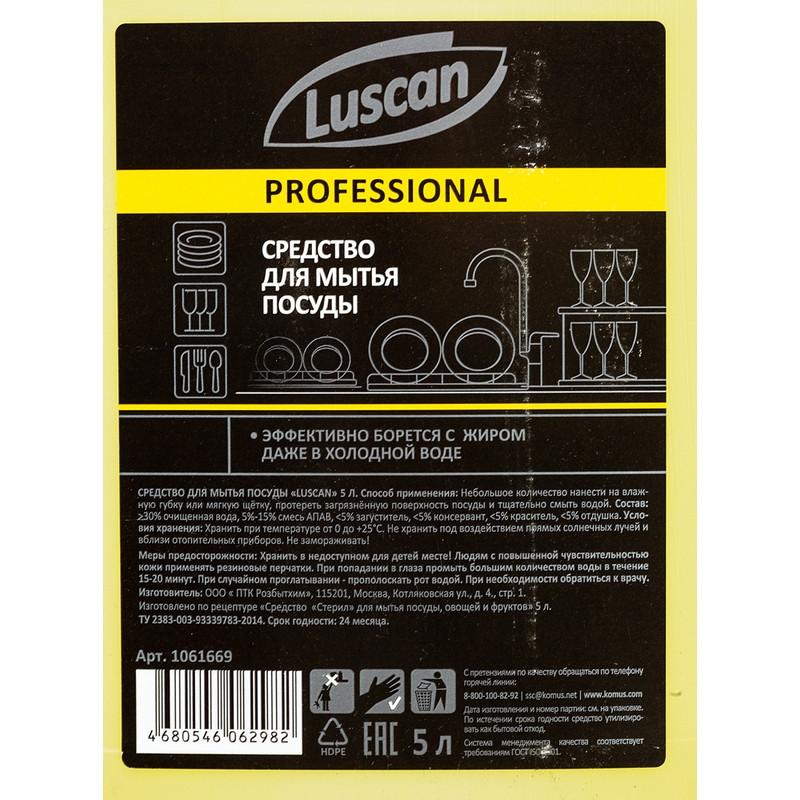 Средство для мытья посуды Luscan антибактериальное 5 л. Средство для мытья посуды Luscan эффективно и безопасно устраняет жир и другие загрязнения с посуды. Средство полностью смывается даже в холодной воде и защищает кожу рук от раздражения. Большой объем упаковки обеспечивает экономичный расход. Состав: ? 30 % вода, < 5 % АПАВ, < 5 % хлорид натрия< 5 % НПАВ, < 5 % Амф. ПАВ, < 5 % изопропиловый спирт, < 5 % парфюмерная композиция, < 5 % триклозан, < 5 % замутнитель, < 5 % лимонная кислота, < 5 % консервант, < 5 % краситель. Объем: 5000 мл. Способ применения: нанести небольшое количество средства на влажную губку, сжать ее рукой до образования пены и протереть губкой грязную посуду и ополоснуть посуду чистой водой. Добавлять средство по мере необходимости в зависимости от количества посуды и степени загрязнения. Меры предосторожности: Осторожно! При попадании в глаза вызывает раздражение! Использовать только по назначению! После работы тщательно вымыть руки. Хранить в плотно закрытой упаковке, отдельно от пищевых продуктов, в недоступном для детей месте. Избегать попадания средства в глаза. В случае попадания средства в глаза немедленно промыть их чистой водой. При необходимости обратиться к врачу. Условия хранения: хранить при температуре не ниже -20 °C и не выше +50 °C. Средство замерзает, восстанавливает свои свойства после полного размораживания и интенсивного встряхивания. Срок годности: 24 месяца. Дата изготовления и номер партии указаны на флаконе. По истечении срока годности средство утилизируют как бытовой отход.