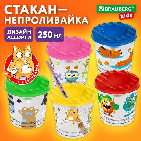 Стакан-непроливайка BRAUBERG KIDS выполнен из прочного пластика и предназначен для промывания кисточек в процессе рисования. Специальная форма стакана исключает возможность вытекания воды.Специальная форма крышки стакана исключает возможность вытекания воды. Линия на прозрачном корпусе указывает на максимально возможный уровень наполнения. Выполнен из прочного пластика. Имеются специальные углубления на крышке для размещения кисточек. Полный объем - 250 мл. Объем до уровня - 75 мл.