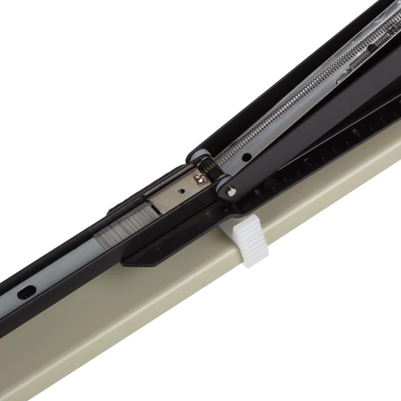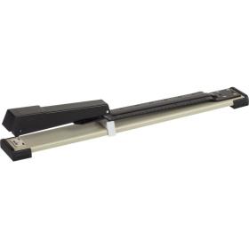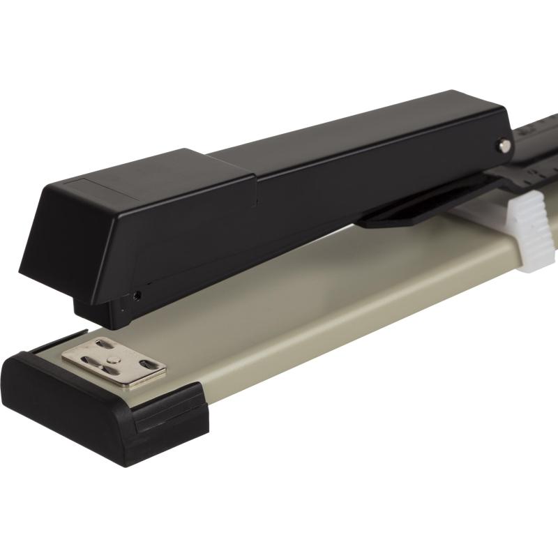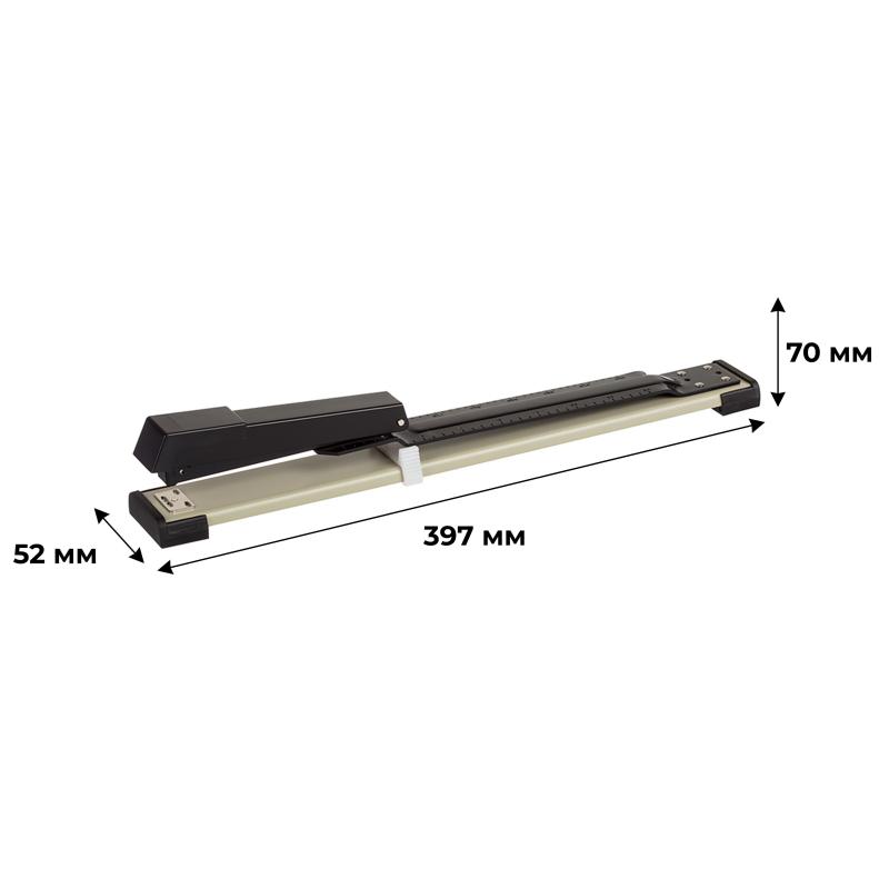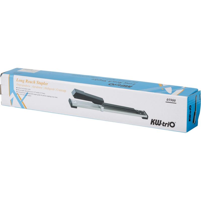 Степлер-брошюровщик KW-trio 5900 предназначен для скрепления крупноформатных документов. Металлический механизм позволяет сшивать открытым и закрытым способами документы толщиной до 20 листов, добавлять документы к готовым брошюрам и регулировать глубину закладки бумаги до 317 мм. Корпус выполнен из пластика черного цвета. Степлер использует металлические скобы размеров № 24/6. Размер изделия 397×52×70 мм. Вместимость скоб — 100 штук.<br> Для эффективного сшивания максимально допустимого объема бумаги необходимо расположить степлер на горизонтальной твердой поверхности, прикладывая усилия, плавно надавить на рычаг (при необходимости двумя руками), разномерно распределяя усилия по поверхности рычага.
