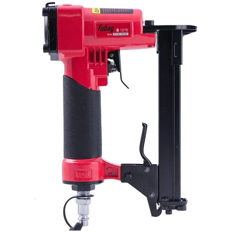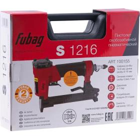 Степлер скобозабивной Fubag S1216 (100155)<br><br>Скобозабивной пистолет Fubag S1216, работающий со скобами с «широкой» спинкой. Подходит для крепления гипсокартона, фанеры и ДСП, обивочного материала, утеплителя, кровельных работ, ремонта мягкой и корпусной мебели. <br><br>Особенности:<br>• Малый вес (всего 0.87 кг) — для комфортной работы скобозабивным пистолетом Fubag S1216; <br>• Пневматический инструмент предназначен для работы в течение длительного периода времени без остановки;<br>• Сечение ножки скобы: 0.9×0.7 мм; <br>• Давление: 4-7 бар; <br>• Рекомендуемый диаметр воздухоподводящего шланга: 3/8 дюйма. <br><br>Внешний вид и/или характеристики товара могут быть изменены производителем в соответствии с производственным процессом.