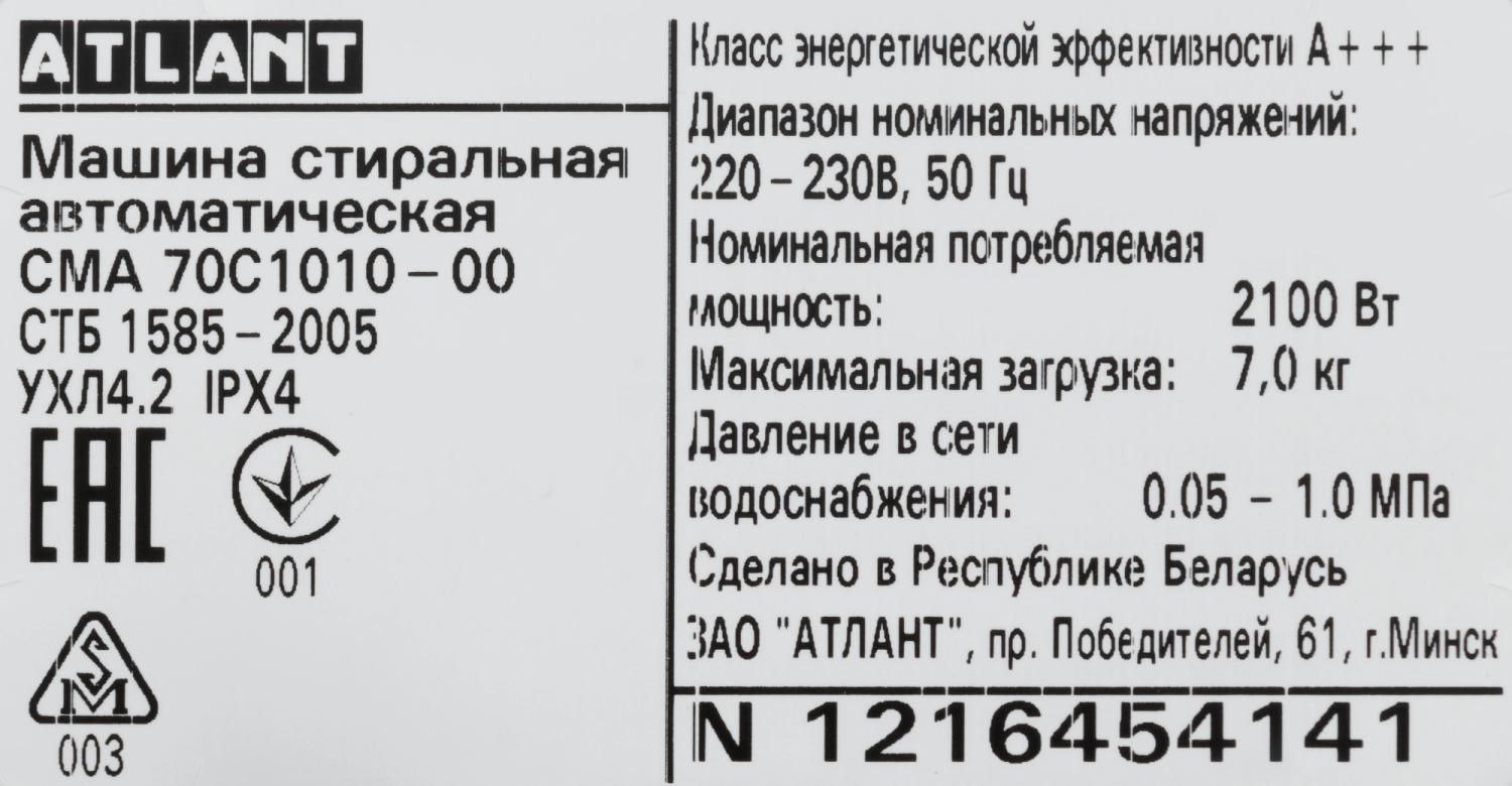 | Регулируемая скорость отжима | 1000/800/600/400/без отжима |