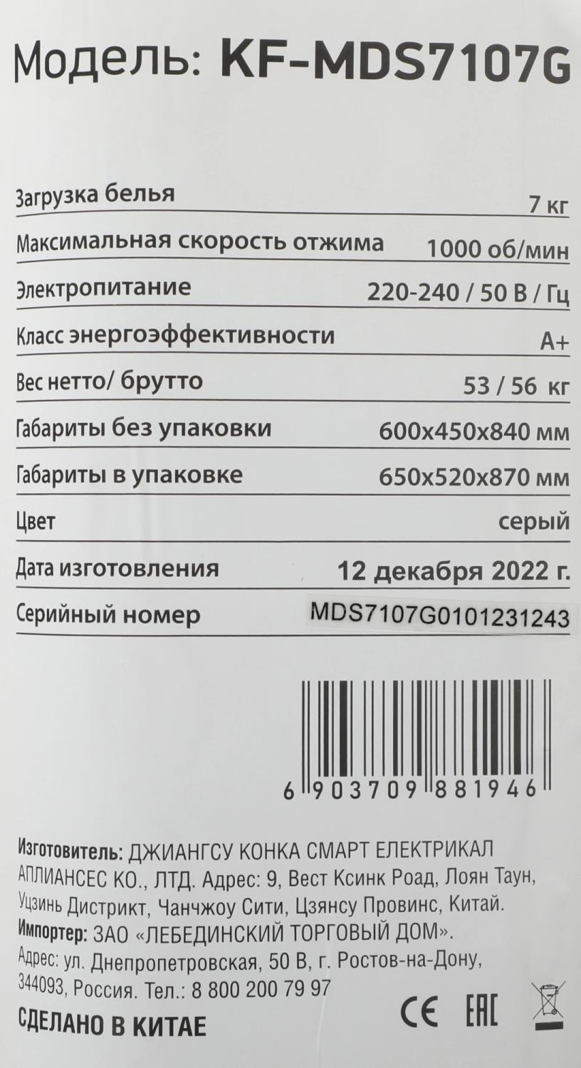 Стиральная машина Kraft KF-MDS7107G класс: A+ загр.фронтальная макс.:7кг серый