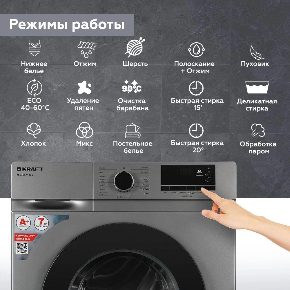 | Безопасность и управление | блокировка от случайного нажатия, дисплей, защита от детей, защита от перегрева, защита от протечек, контроль дисбаланса, контроль уровня пены, самодиагностика неисправностей, таймер отсрочки запуска |