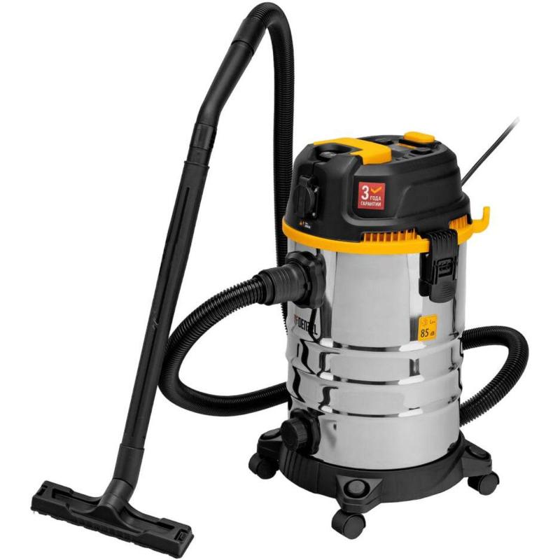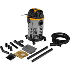 Пылесос строительный Denzel RVC30 28203 мощностью 1400 Вт, с баком объемом 30 л и шлангом длиной 3 м, оснащен розеткой с автосинхронизацией и предназначен для уборки бетонной, кирпичной пыли, опилок, стружки, также предусмотрена функция сбора воды. К пылесосу можно подключить электроинструмент, чтобы минимизировать количество пыли, образующейся в результате пиления, сверления, фрезерования. Техника используется во время проведения строительных и ремонтных работ, будет полезна для поддержания чистоты в мастерской, гараже, производственном помещении. Преимущества Термозащита - в случае перегрева двигатель автоматически отключается, что предотвращает его поломку. Влагозащита - внутренние компоненты надежно изолированы от попадания пыли и брызг воды по стандарту IP44. Простое подключение электроинструмента - в комплект поставки входит набор переходников для соединения шланга с пылеудаляющим патрубком. Автосинхронизация - пылесос включается одновременно с запуском электроинструмента. Функция выдува - пылесос можно использовать для очистки от мусора дорожек, ступеней, труднодоступных мест, а также для продувки деталей от пыли. Удобная уборка в узком пространстве - в комплект поставки входит щелевая насадка, облегчающая удаление пыли из ящиков, шкафов, отопительных радиаторов и т.д.