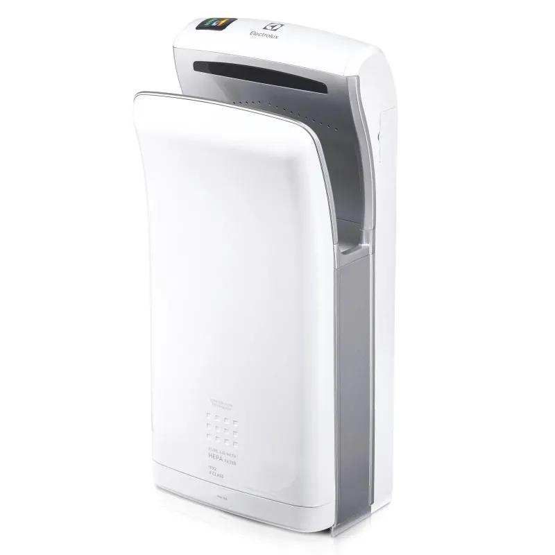 Сушилка для рук электрическая Electrolux EHDA/HPF-1200W сенсорная белая. <br>Модель EHDA/HPF-1200W — это отличное и современное решение для обеспечения быстрой и эффективной сушки рук. Прибор приводится в действие бесконтактно за счет чувствительного инфракрасного датчика. Он срабатывает в тот момент, когда пользователь подносит руки к воздуховыпускному отверстию и отключает прибор ровно тогда, когда пользователь их убирает. Такой способ включения прибора обеспечивает большую гигиеничность относительно контактного способа и экономию электроэнергии за счет более точных и коротких интервалов включения и отключения. В модели EHDA/HPF-1200W реализована технология двустороннего обдува Counter Flow, представляющая собой особую систему отверстий сушильного отсека, которая позволяет сушить руки одновременно с двух сторон мощными потоками теплого воздуха. Использование этой технологии делает процесс сушки рук более удобным, а помещение — чистым, поскольку вода, сдуваемая с рук в виде капель и брызг, попадает на дно сушильного отсека и стекает в специальную емкость — контейнер. Данный контейнер, расположенный на нижней стороне прибора, легко снимается и осушается. Специально разработанный мощный мотор позволяет добиться впечатляющей скорости потока в 324 км/ч, а это значит, что руки можно высушить менее чем за 10 секунд. Для удобства эксплуатации модель EHDA/HPF-1200W оснащена световым индикатором, отображающим основные режимы работы прибора. Также сушилка снабжена системой очистки воздуха из 2 фильтров: фильтром грубой очистки воздуха от крупных частиц пыли и HEPA-фильтром, который очищает воздух в помещении от мелких частиц и исключает контакт кожи с пылью и бактериями. Прибор изготовлен из высокопрочного и экологически чистого ABS пластика, который сохранит его первозданный вид и обеспечит стабильную работу на долгие годы. <br>Ключевые преимущества: <br>— Чувствительный инфракрасный датчик. <br>— Система Country Flow. <br>— Погружной способ сушки рук. <br>— HEPA Фильтр. <br>— Класс пылевлагозащищенности IPX2. <br>— Контейнер для сбора жидкости. <br>Эксплуатация электросушителя для рук:.<br>Включение электросушителя происходит автоматически, как только пользователь подносит руки на расстояние не более 20 см. <br>Отключение электросушителя происходит автоматически, через 1 сек после того, как пользователь уберет руки. <br>Способ крепления: на стену, вертикально. <br>Комплектация: <br>Электросушитель — 1 шт.<br>Монтажная панель — 1 шт. <br>Шурупы для крепления монтажной панели — 4 шт. <br>Дюбели для шурупов — 4 шт. <br>Вибропоглощающие прокладки — 4 шт. <br>Винты для фиксации прибора на монтажной панели — 2 шт. <br>Гарантия 2 года.