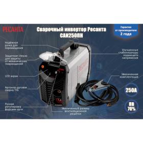 Сварочный инвертор Ресанта САИ250ПН (65/21) передвижная электростанция, вырабатывающая электрический ток для электродуговой сварки или резки металла. Сварочники серии laquo;ПН raquo; отличаются наличием информационного дисплея, эргономичным дизайном, обеспечивающим лучшее охлаждение системы. В САИ ПН добавилась регулируемая функция форсажа дуги laquo;ARCFORCE raquo;, которая предназначена для повышения устойчивости сварочной дуги и лучшей текучести металла.<br><br>Комплект поставки<br>Сварочный инверторный — 1 шт.<br>Кабель с электрододержателем — 1 шт.<br>Кабель с клеммой заземления — 1 шт.<br>Ремень для переноски — 1 шт.<br>Инструкция по эксплуатации — 1 шт.