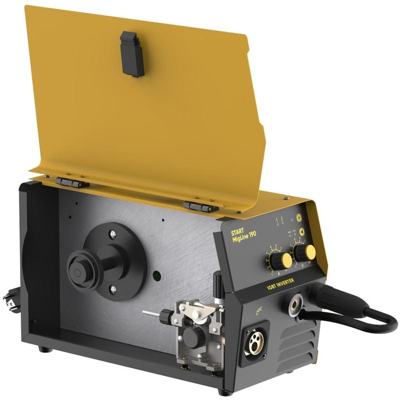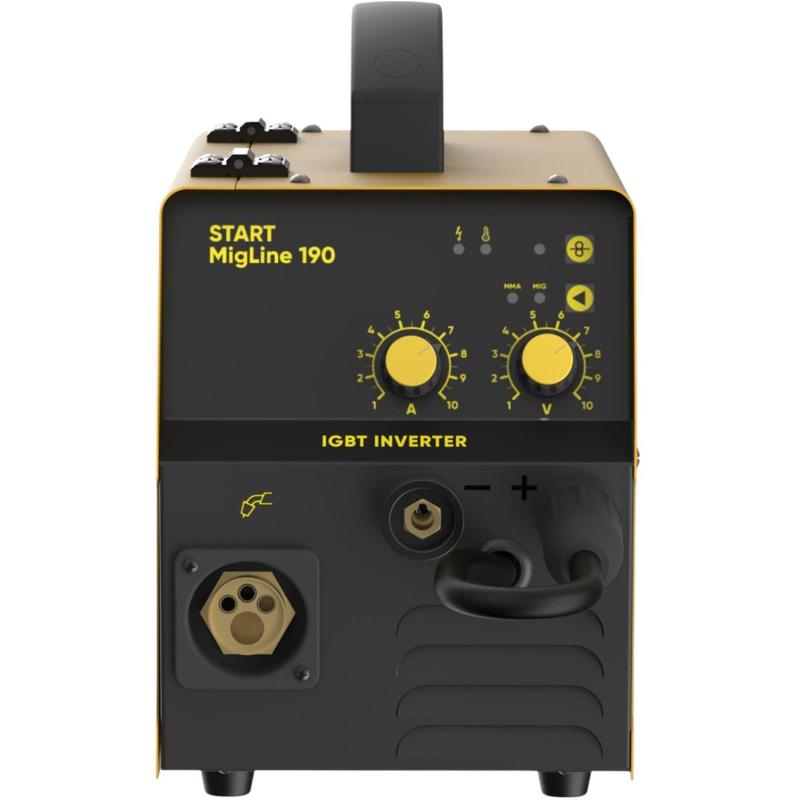 Сварочный аппарат Start MigLine 190 (2ST190)<br><br>Обновлённый сварочный полуавтомат инверторного типа Start MigLine 190. Универсальный сварочный аппарат (2 в 1) предназначенный для полуавтоматической сварки в среде защитных газов (MIG/MAG) и ручной дуговой сварки MMA. Благодаря точной настройке всех параметров — аппарат идеален для кузовного ремонта. Аппарат легко настраивается, добиться качественного, красивого шва и минимальное количество брызг под силу даже начинающим сварщикам.<br><br>Особенности<br>• Полуавтоматическая сварка на постоянном токе в среде защитного газа (MIG/MAG) и ручная дуговая сварка штучными электродами (MMA);<br>• Ручная дуговая сварка штучными электродами (MMA);<br>• Стабильность дуги и плавная регулировка подачи проволоки;<br>• Сварка проволокой 0,8 мм/ 1,0 мм;<br>• Полный комплект;<br>• Гарантия 12 месяцев.<br><br>Применение<br>• Кузовной ремонт;<br>• Ковка;<br>• Монтаж;<br>• Строительство;<br>• Малое производство.<br><br>Комплектация<br>• Полуавтоматическая горелка Start MS 15 (3 метра) — 1 шт;<br>• Кабель с клеммой заземления — 1 шт;<br>• Кабель с электрододержателем — 1 шт;<br>• Инструкция.<br><br>Внешний вид и/или характеристики товара могут быть изменены производителем в соответствии с производственным процессом.
