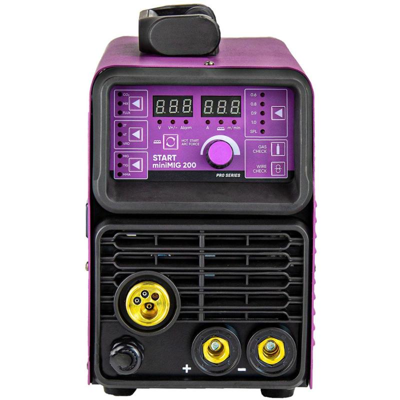 Сварочный аппарат Start miniMIG 200 (2W202)<br><br>Инверторный полуавтомат Start miniMIG 200 — это новый уменьшенный корпус, новые характеристики сварочной дуги и более лёгкое управление. Модель предназначена для полуавтоматической сварки в среде защитного газа MIG-MAG, для ручной дуговой сварки штучными электродами MMA.<br><br>Теперь полуавтомат имеет полностью синергетическое управление, для настройки всех параметров используется всего 1 регулятор. Аппарат сам подберёт необходимые значения для идеального шва. Start miniMIG 200 может использоваться как в быту так и на производстве благодаря гарантии 24 месяца и классу защиты IP 21S.<br><br>Особенности<br>• Лёгкая настройка параметров сварки MIG/MAG, синергетическое управление одним регулятором;<br>• Возможностью ручной коррекции сварочного напряжения и индуктивности;<br>• 2-х и 4-х тактный режим управления сварочной горелкой;<br>• Лёгкая смена полярности благодаря кабелю с быстросъёмным соединением на лицевой панели аппарата;<br>• Цифровой дисплей для отображения параметров сварки;<br>• Силовой блок на базе инверторной технологии IGBT нового поколения;<br>• Автоматическая защита от перенапряжения и сверхтока;<br>• Полная комплектация сварочных аксессуаров для всех режимов сварки;<br>• Современный дизайн;<br>• Гарантия 24 месяца.<br><br>Применение<br>• автосервисы;<br>• строительство;<br>• монтаж металлоконструкций.<br><br>Комплектация<br>• Сварочная горелка MIG MS 15 (3м);<br>• Кабель с электрододержателем;<br>• Кабель с клеммой заземления;<br>• Газовый шланг;<br>• Инструкция.<br><br>Внешний вид и/или характеристики товара могут быть изменены производителем в соответствии с производственным процессом.