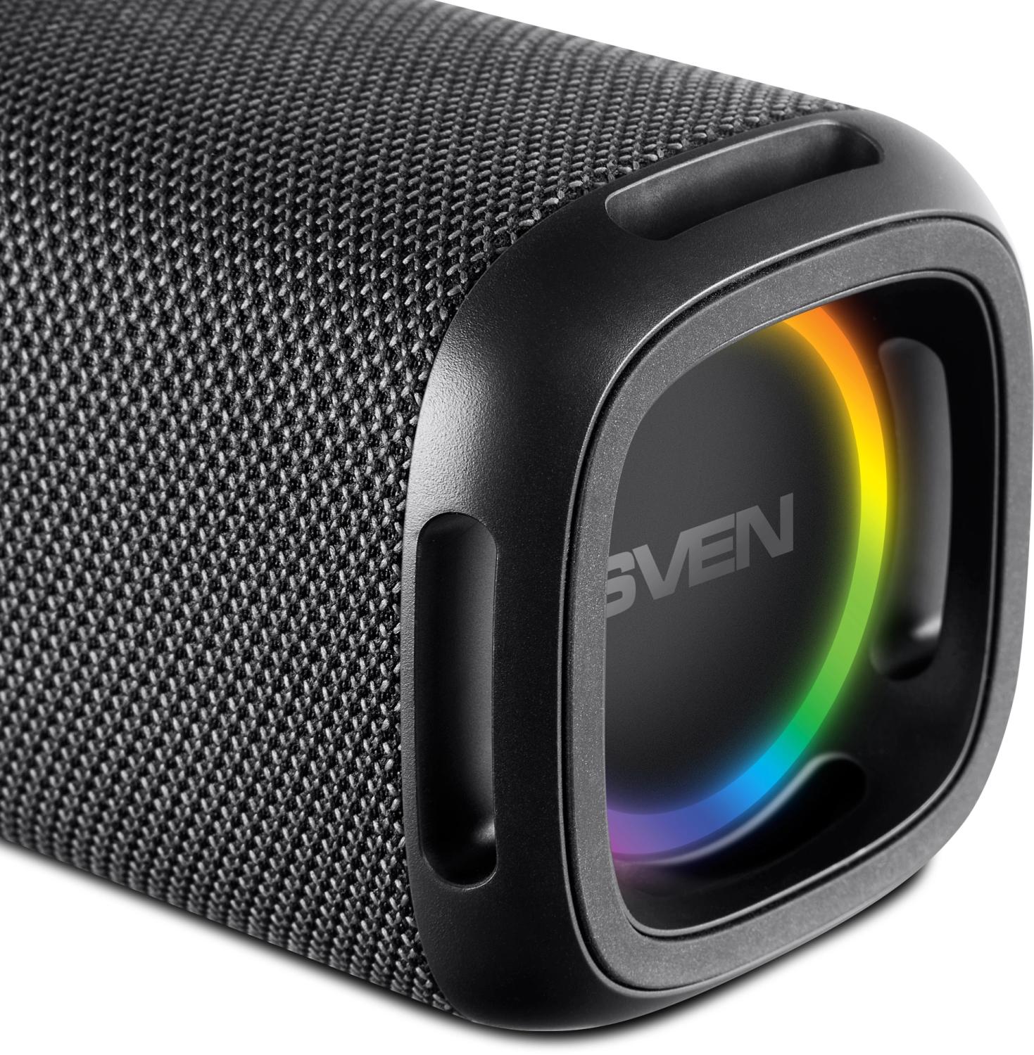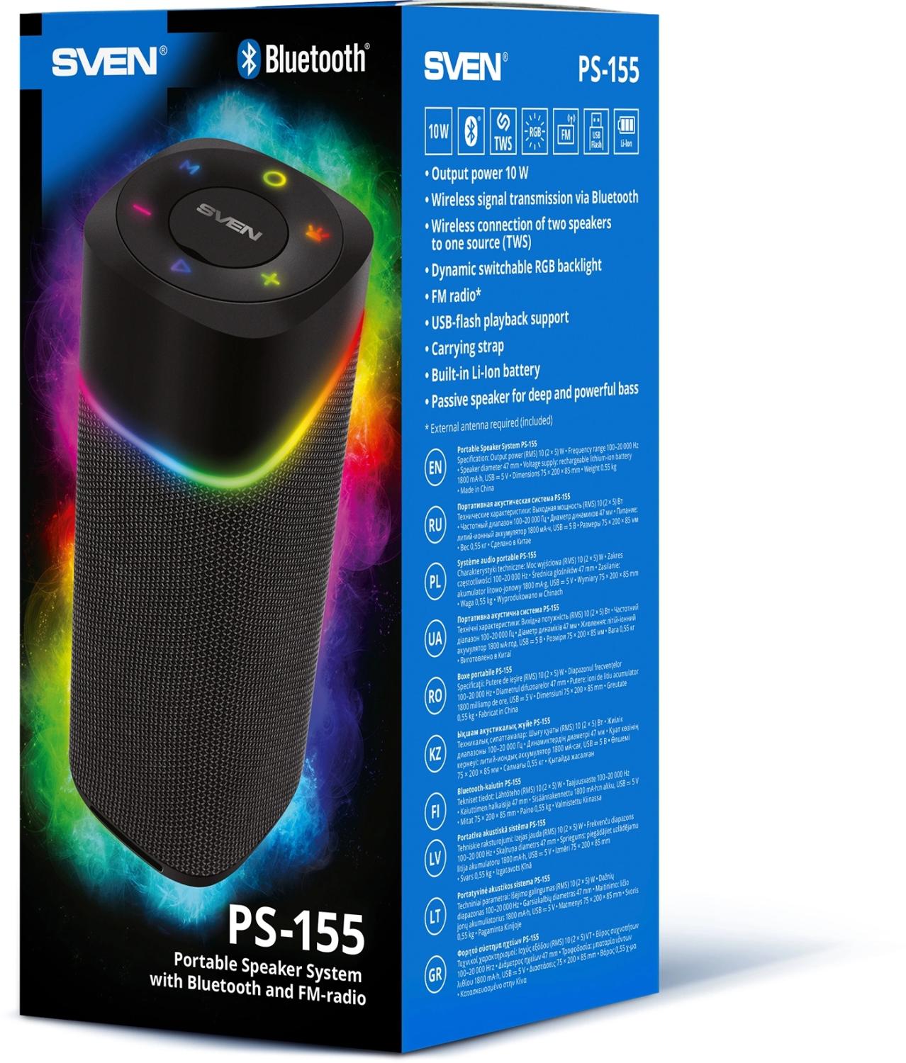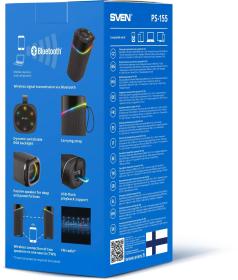 Акустическая система Sven PS-155 чёрная с подсветкой (SV-022334) Выходная мощность 10 Вт Передача сигнала по Bluetooth Беспроводное подключение двух колонок к одному источнику звука (TWS) Динамическая отключаемая RGB подсветка FM-радио Воспроизведение музыки с USB flash Ремешок для переноски Встроенный Li-Ion аккумулятор Пассивный излучатель для глубокого и мощного баса Внешний вид и/или характеристики товара могут быть изменены производителем в соответствии с производственным процессом.