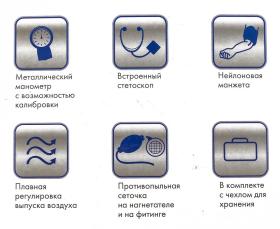 | Описание | Противопыльная сеточка на нагнетателе и фитинге. Стандартная нейлоновая манжета. Металлический манометр с возможностью калибровки. Встроенный стетоскоп. Плавная регулировка выпуска воздуха. |