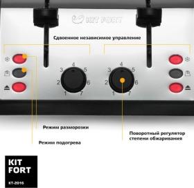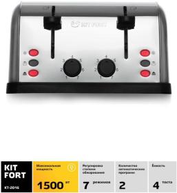 Особенности Kitfort KT-2016 — сдвоенный: он состоит из двух секций с независимым управлением в едином корпусе и позволяет приготовить от одного до четырех тостов одновременно.