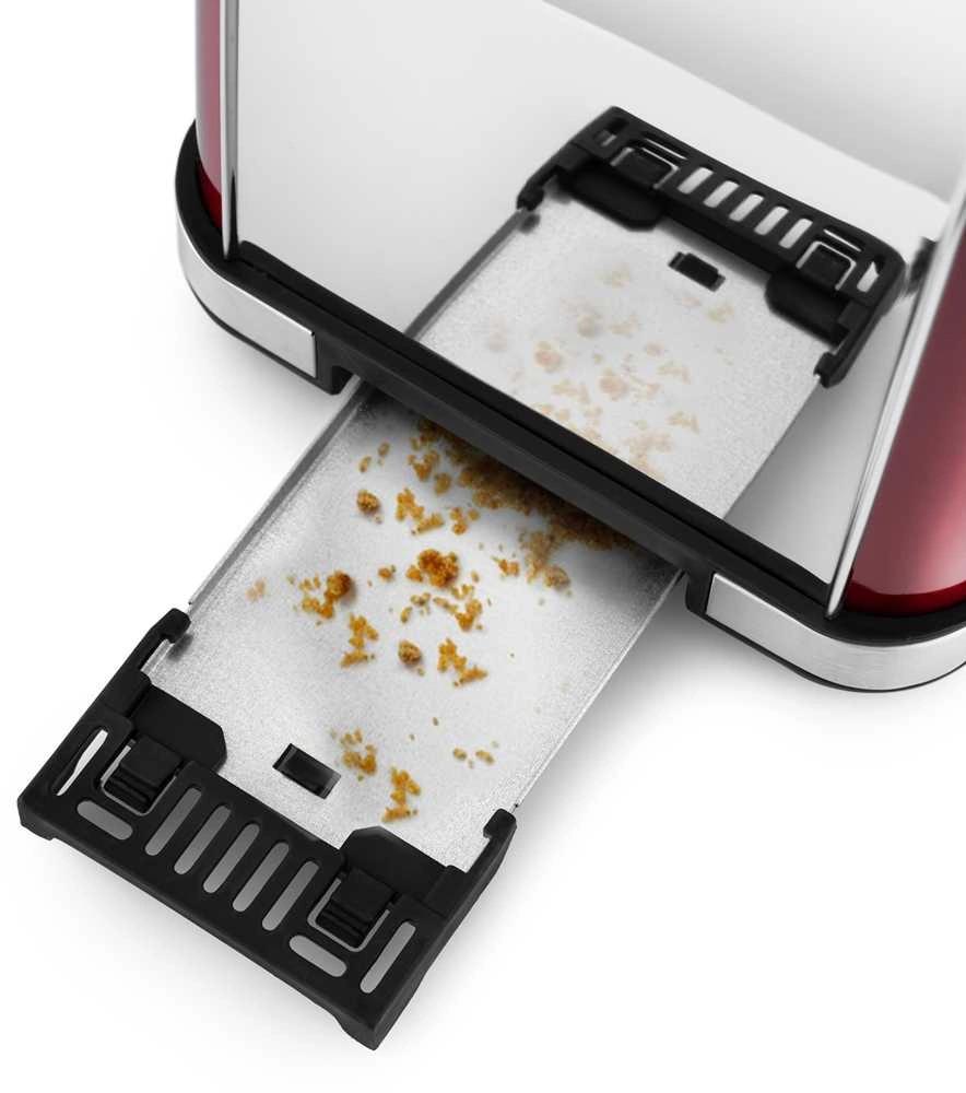 Снизу расположен выдвижной поддон для крошек, поэтому чистить тостер просто и удобно. Также снизу есть отсек для смотки шнура.