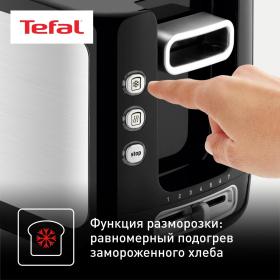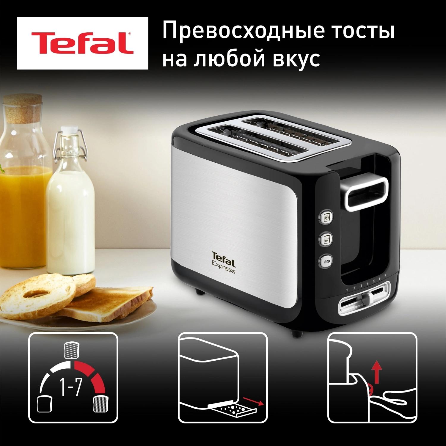 Тостер Tefal Express TT365031 в корпусе серебристо-черной расцветки оснащен системой автоцентрирования тостов, что позволяет добиться равномерной прожарки.Управление прибором механическое. Режимов работы семь. Поддерживаются функции разогрева и разморозки. При выборе неправильного режима нагрева его можно отменить, нажав соответствующую кнопку на корпусе. По истечении установленного времени тосты поднимаются автоматически. На корпусе присутствует индикация включения. Тостер работает от электросети и потребляет 850 Вт. Корпус изготовлен из металла, он термоизолированный. Предусмотрены поддон для крошек и отсек для сетевого кабеля. Прорезиненные ножки тостера не скользят по поверхности стола.