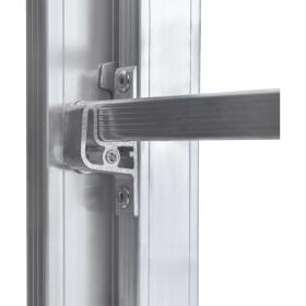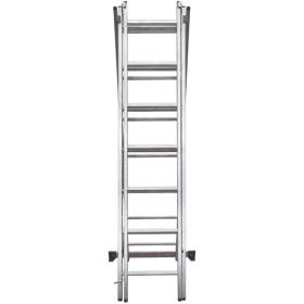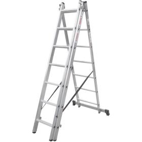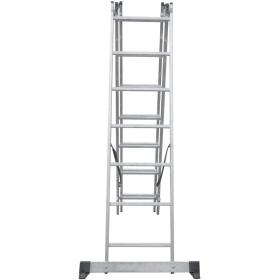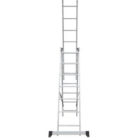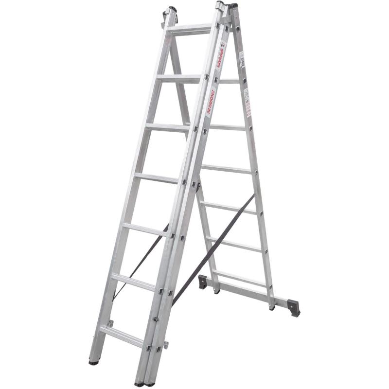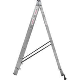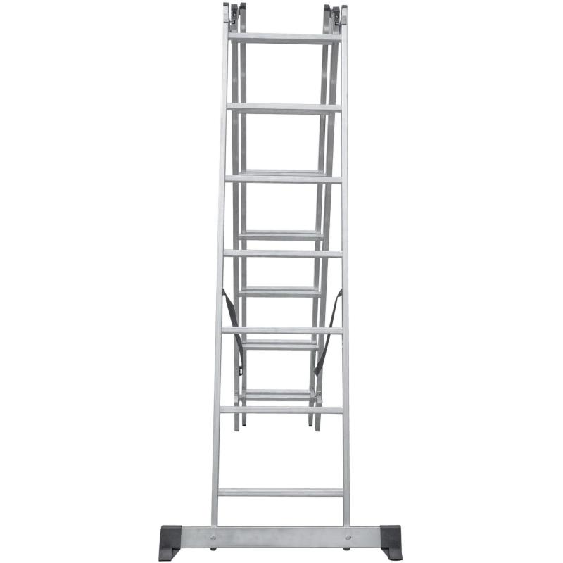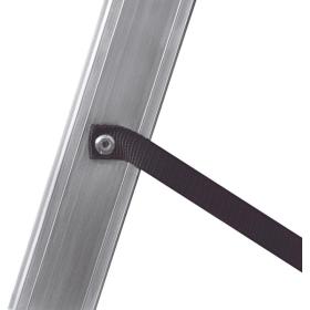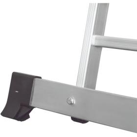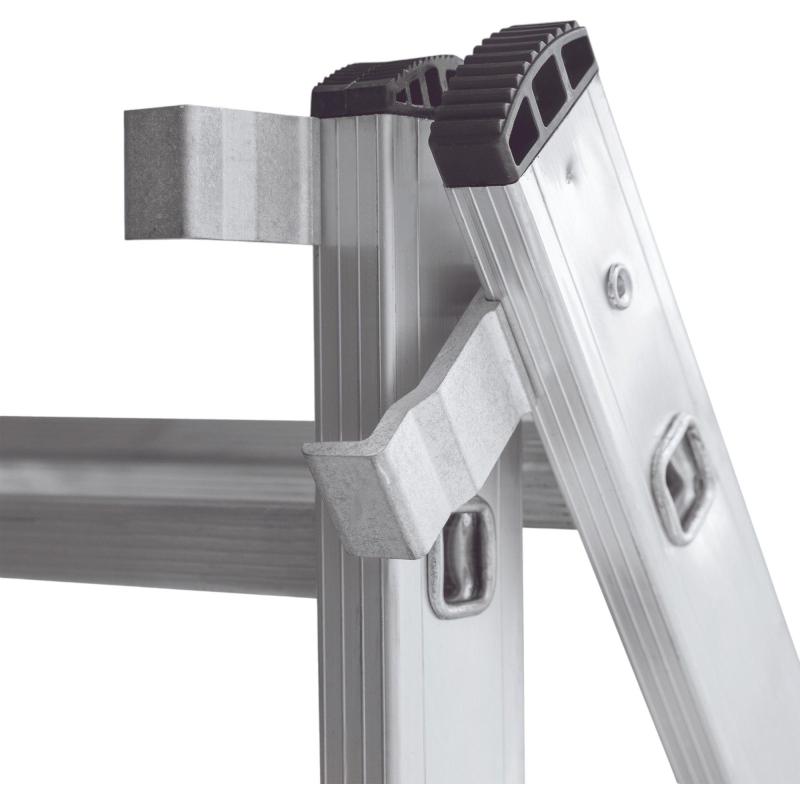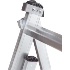 Широкая поперечная траверса обеспечивает высокую устойчивость, а надёжно закреплённые на стойках и траверсе пластиковые наконечники препятствуют скольжению. Верхняя секция легко вынимается и устанавливается и может служить отдельной приставной лестницей.