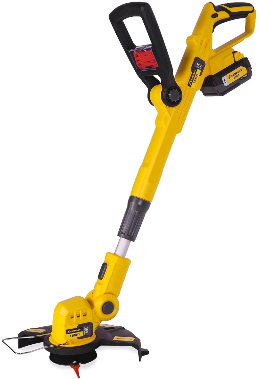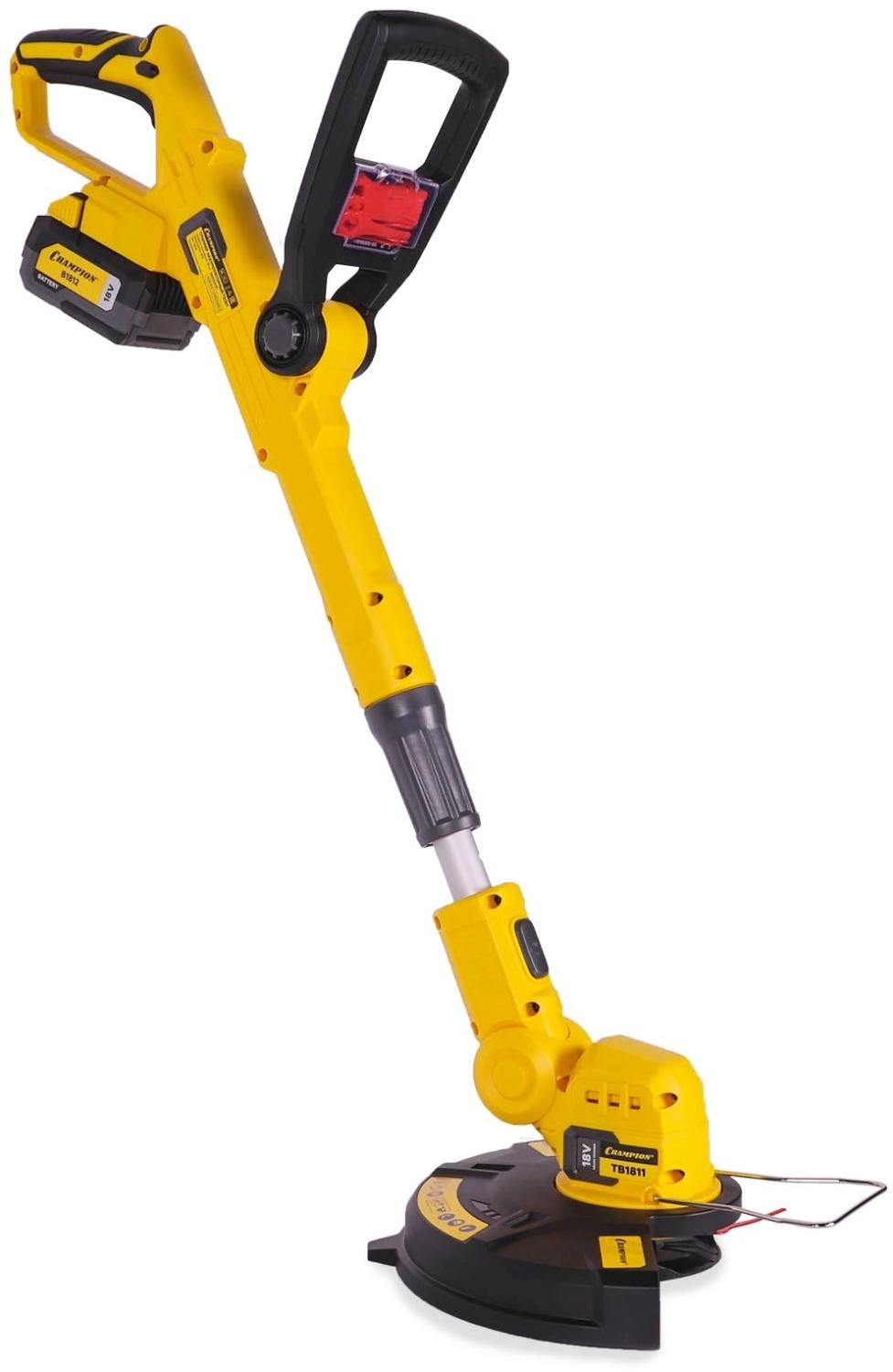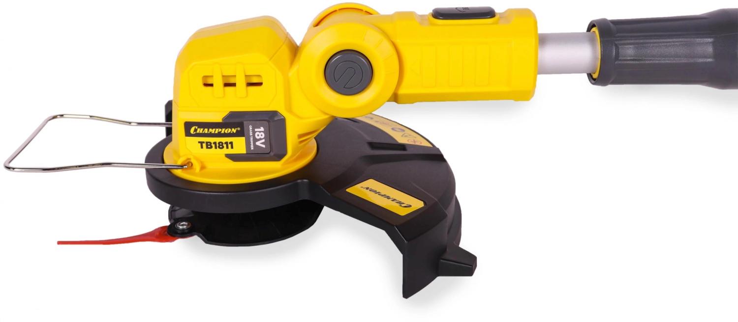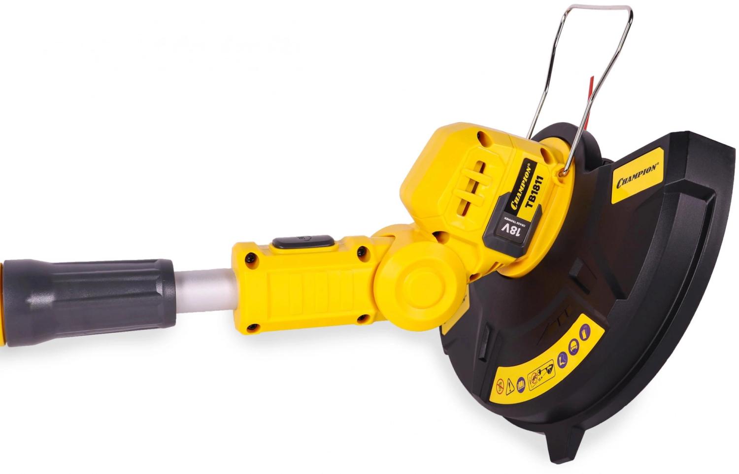 Триммер аккумуляторный Champion TB1811 без АКБ и ЗУАккумуляторный триммер Champion TB1811 применяется для стрижки газона на частном участке.Преимущества- Благодаря работе от аккумулятора отличается низким уровнем шума и отсутствием вредных выхлопов.- Телескопическая штанга обеспечивает удобство работы пользователям разного роста.- Предусмотрена скоба для защиты растений от повреждений.Комплектация- Аккумуляторный триммер- Защитный кожух- Рукоятка передняя с комплектом запасных ножей (20 шт.)- Адаптер ножа- Скоба ограничительная- Винт крепления адаптера- Винты крепления защитного кожуха- Инструкция- УпаковкаВнимание! Аккумуляторы и зарядное устройство не входят в комплект.Внешний вид и/или характеристики товара могут быть изменены производителем в соответствии с производственным процессом.