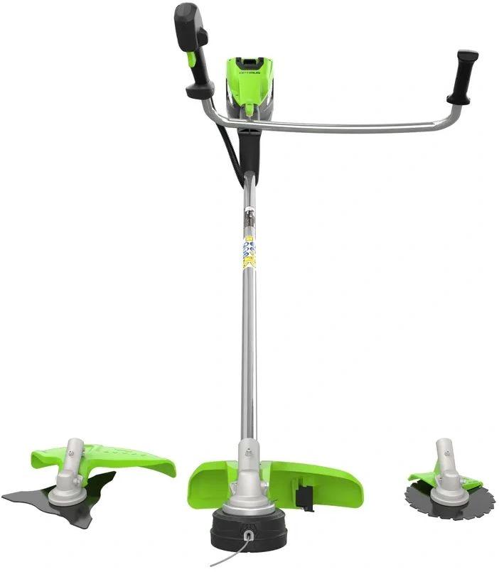 | Комплект поставки | Триммер аккумуляторный Greenworks TB201H, Арт. 2112407, 82V, Трехлопастной нож, Диск-кусторез, Ранцевый ремень, Руководство по эксплуатации, Гарантийный талон, АКБ 5Ач, зарядное устройство |
