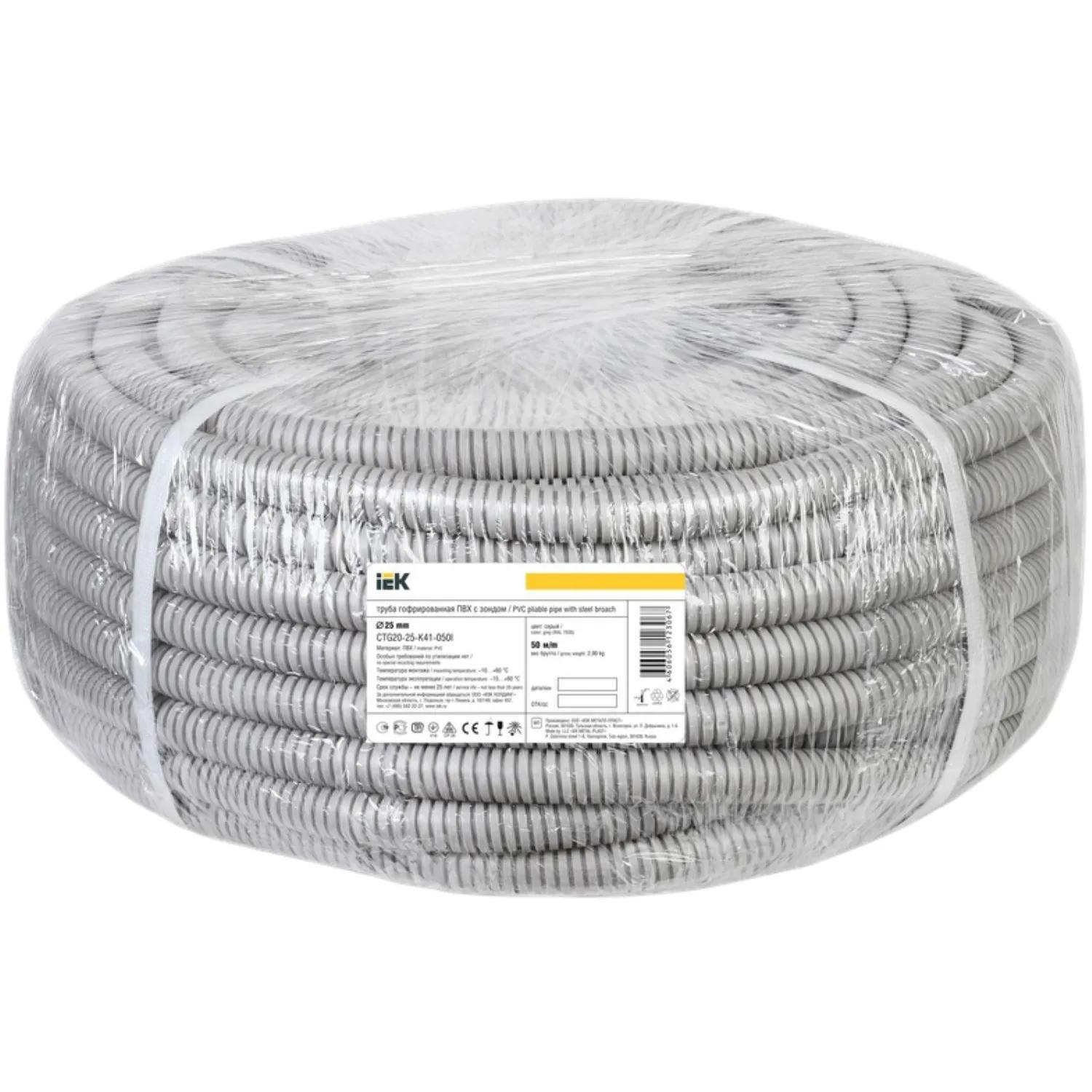 Труба гофрированная IEK Elasta (CTG20-25-K41-050I)<br><br>Труба гофрированная d = 25 мм с зондом (50 м). Гофрированные трубы используются для прокладки силовых и слаботочных линий скрытого типа внутри зданий и сооружений. Благодаря гибкости трубы, прокладка кабеля осуществляется с минимальными трудозатратами и практически не требует дополнительных аксессуаров.<br>Трубы гофрированные ПВХ соответствуют требованиям ТУ 27.33.14-002-83135016-2017.<br><br>Внешний вид и/или характеристики товара могут быть изменены производителем в соответствии с производственным процессом.