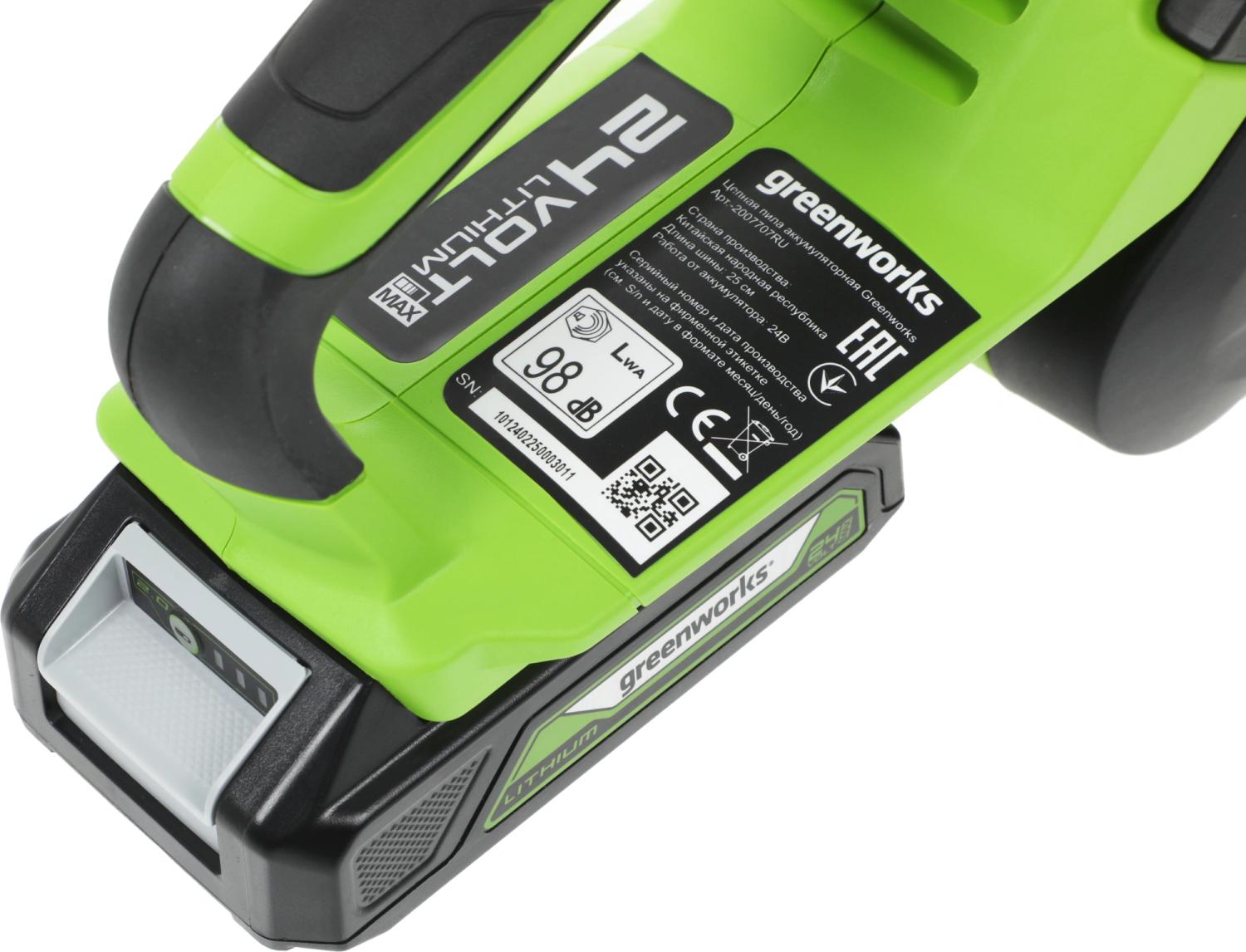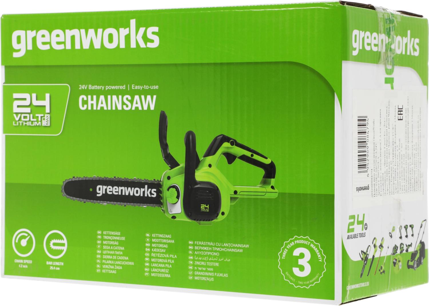 | Комплектация | Аккумуляторная цепная пила 25 см. арт. 2007707; аккумулятор Greenworks 24V 2A*ч; зарядное устройство Greenworks 24V; руководство по эксплуатации; гарантийный талон. |