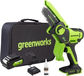 | Комплектация | Аккумулятор G-24 24V GREENWORKS G24B2 2Ah - 1 шт., Зарядное устройство GREENWORKS G24UC2, 24 В - 1 шт., Пила цепная аккумуляторная GREENWORKS G24MCS10 24V |