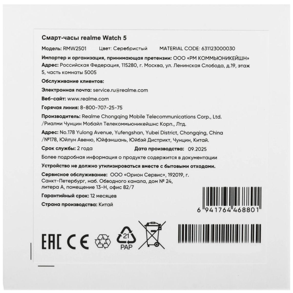 Умные часы Realme watch 5, Серебряный / 4dealer.ru