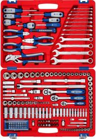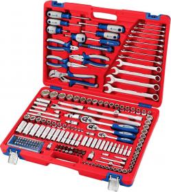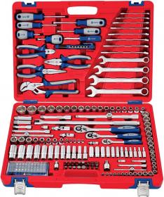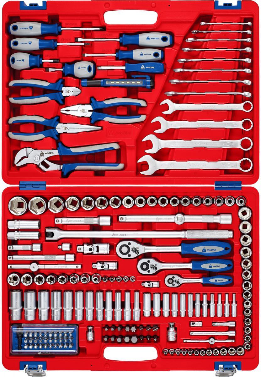 Инструменты марки Мастак изготовлены из инструментальной легированной хром-ванадиевой стали специального сплава. Технология изготовления ключей и головок включает в себя метод горячей ковки с последующей термообработкой, придающим инструментам особую прочность и высокую надёжность, что даёт возможность профессионального использования набора в условиях автосервисной мастерской, станции технического обслуживания, а также на производстве. Хромированное покрытие защищает инструменты от коррозии, специальная насечка на ободке головок, рукоятках воротков и других силовых инструментов исключает проскальзывание руки при работе. Кейс, изготовленный из прочного пластика, устойчив к ударам, удобен для хранения, защищает инструмент от утери и воздействия влаги.<br><br>Комплектация<br>Головки и принадлежности 1/2″<br>— Головки торцевые стандартные 6-гранные — 8, 9, 10, 11, 12, 13, 14, 15, 16, 17, 18, 19, 21, 22, 24, 27, 30, 32 мм;<br>— Головки торцевые TORX Е-стандарт — E10, E12, E14, E16, E18, E20, E22, E24;<br>— Трещотка флажковая с кнопкой 45 зубцов — длина 250 мм;<br>— Вороток с шарниром — 430 мм;<br>— Удлинители стандартные — 125, 250 мм;<br>— Кардан;<br>— Переходник с отверстием для воротка 3/8″ х 1/2″;<br>— Переходник адаптер для вставок (бит) F1/2″ > F5/16″ (8 мм).<br>Головки и принадлежности 3/8″<br>— Головки торцевые стандартные 6-гранные — 8, 9, 10, 11, 12, 13, 14, 15, 16, 17, 18, 19, 21, 22 мм;<br>— Головки торцевые глубокие 6-гранные — 8, 9, 10, 11, 12, 13, 14, 15, 17, 19, 21, 22 мм;<br>— Головки торцевые TORX Е-стандарт — E10, E12, E14, E16, E18, E20, E22, E24;<br>— Головки свечные 12-гранные — 14, 16 мм;<br>— Трещотка флажковая с кнопкой 45 зубцов — длина 200 мм;<br>— Вороток скользящий Т-образный — 165 мм;<br>— Удлинители стандартные — 75, 150 мм;<br>— Кардан;<br>— Переходник с отверстием для воротка 3/8″ х 1/4″;<br>— Переходник адаптер для вставок (бит) F3/8″ >F5/16″ (8 мм);<br>Головки и принадлежности 1/4″<br>— Головки торцевые стандартные 6-гранные — 4, 4.5, 5, 5.5, 6, 7, 8, 9, 10, 11, 12, 13 мм;<br>— Головки торцевые глубокие 6-гранные — 4, 4.5, 5, 5.5, 6, 7, 8, 9, 10, 11, 12, 13 мм;<br>— Головки торцевые TORX Е-стандарт — E4, E5, E6, E7, E8;<br>— Трещотка флажковая с кнопкой 45 зубцов — длина 125 мм;<br>— Вороток скользящий Т-образный — длина 115 мм;<br>— Удлинители стандартные — 50, 100 мм;<br>— Кардан;<br>— Отвёртка-вороток — 150 мм;<br>— Переходник адаптер для вставок (бит) — F1/4 > F1/4″;<br>— Вставки (биты) 1/4″ (6.35 мм);<br>— Набор вставок с держателем для дрели — 31 предмет;<br>— Вставки (биты) 5/16″ (8 мм): крестовые Phillips PH2, PH3, PH4, шлицевые Slotted 8, 10, 12 мм, TORX T40, T45, T50, T55, T60, шестигранные H7, H8, H10, H12, H14;<br>— Ключи комбинированные — 8, 10, 11, 12, 13, 14, 15, 16, 17, 19, 21, 22 мм;<br>— Отвёртки — крестовые Phillips PH1×75 мм, PH2×100 мм, PH2×38 мм, шлицевые Slotted 5.5×75 мм, 6.5×100 мм, 6.5×38 мм;<br>— Плоскогубцы комбинированные — 175 мм;<br>— Плоскогубцы удлинённые тонкие — 200 мм;<br>— Бокорезы стандартные — 150 мм;<br>— Захват переставной — 250 мм;<br>— Фонарь LED Pen 2W1 шт;<br>— Кейс.<br><br>Внешний вид и/или характеристики товара могут быть изменены производителем в соответствии с производственным процессом.