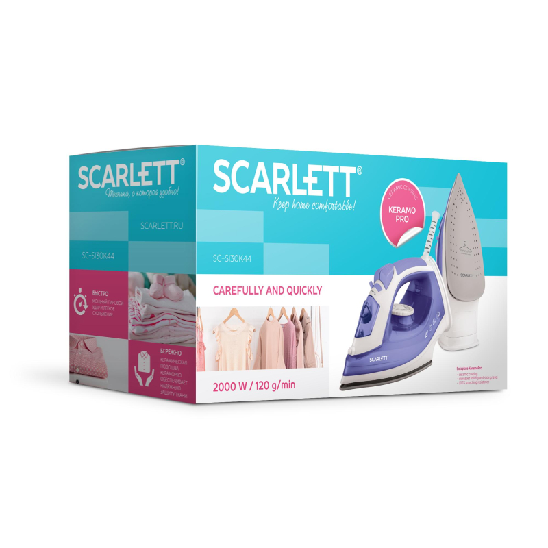 Утюг SC-SI30K44 в нежно лиловом цвете мощностью 2000 Вт оснащена керамической подошвой KeramoPro, которая позаботится о качественной работе прибора.Функция антинакипь обеспечит долгий срок службы утюга. Вертикальное отпаривание, паровой удар 120 г/мин, регулировка степени отпаривания до 40 г/мин помогут превратить утомительный процесс глажки белья в приятные домашние хлопоты. Световой индикатор нагрева делает пользование SC-SI30K44 простым и интуитивно понятным. Носик хорошо продуманной формы проникает в ткань между швами и пуговицами, позволяя достичь наилучшего результата. Шаровое крепление сетевого шнура препятствует его постоянному спутыванию в процессе использования модели.