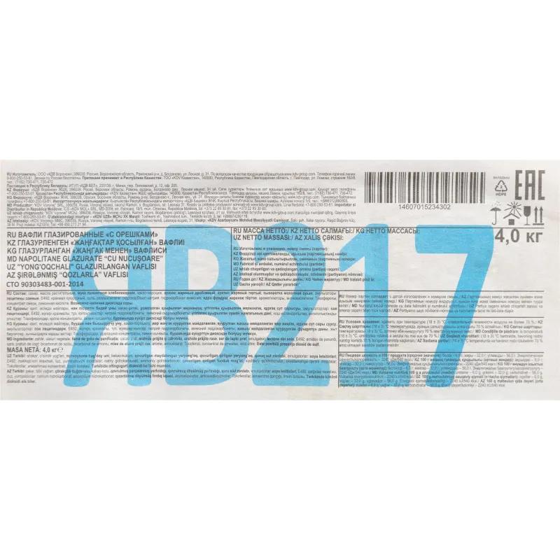 Вафли Яшкино с орехами глазированные 4 кг<br><br>Семь слоёв хрустящих вафель с начинкой из 100% натурального какао и фундука, в глазури.<br>— Много начинки.<br>— Отборный фундук.<br>— Какао в начинке и глазури.<br>Состав: сахар, масла растительные, мука пшеничная хлебопекарная, какао-порошок, арахис жареный дроблёный, арахис жареный тёртый, сыворотка молочная сухая, эмульгаторы: лецитины соевые, Е492; крахмал кукурузный, соль, разрыхлители: гидрокарбонат натрия, гидрокарбонат аммония; ядро фундука жареное тёртое, ароматизаторы, антиокислители: Токоферолы, концентрат смеси, лимонная кислота. Возможно наличие диоксида серы.<br>Пищевая ценность на 100 г: белки — 6 г, жиры — 32 г, углеводы — 56 г.<br>Энергетическая ценность: 540 ккал/2240 кДж.<br>Срок годности: 12 месяцев.<br>Условия хранения: хранить при температуре (18 ± 3) °С и относительной влажности воздуха не более 75 %. Не подвергать воздействию прямых солнечных лучей.