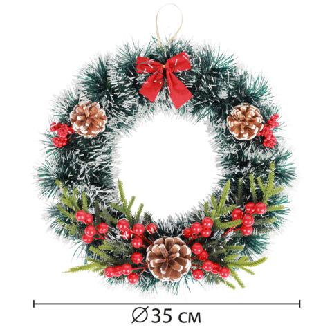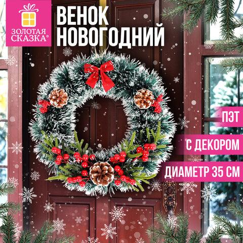 Материал – ПЭТ. Цвет – зелёный с белыми кончиками. Венок, украшенный ветками красных ягодами, шишками, бантиками, создает особую праздничную атмосферу. К основанию венка прикреплена лента, за которую можно легко повесить венок на стену или дверь. Можно разместить не только на вертикальную, но и горизонтальную поверхность, сделав частью новогоднего украшения и декорации.