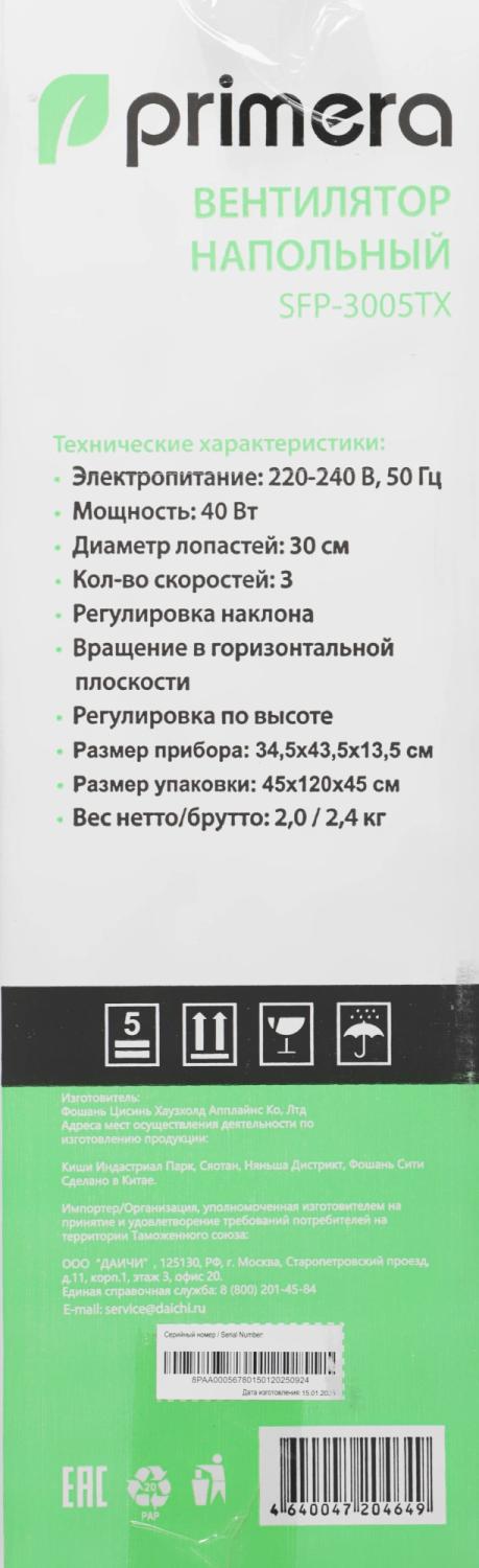 Вентилятор напольный Primera SFP-3005TX 35Вт скоростей:3 белый/серый / 4dealer.ru