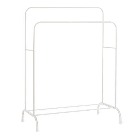 Две железных перекладины вмещают до 35 плечиков, распределенная нагрузка — до 60 кг. Перекладина оснащена ограничителями, предотвращающими соскальзывание плечиков. Внизу полка для размещения обуви, коробок или органайзеров. На ножках предусмотрены заглушки, защищающие пол от повреждений. Мобильная благодаря минимальному весу. Изделие поставляется в разобранном виде в картонной коробке. Простая сборка согласно инструкции.