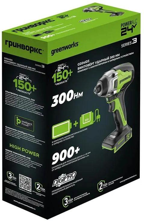 | Комплект поставки | Винтоверт ударный Greenworks 3802807CUB (GD24ID3); поясная клипса + винт; АКБ 4Ач High Power; зарядное устройство; руководство по эксплуатации; гарантийный талон; картонная коробка. |