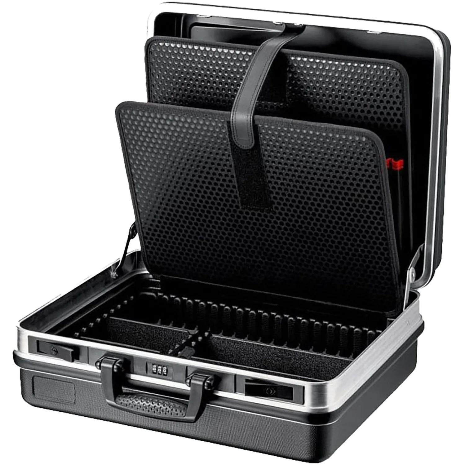 Ящик для инструментов Knipex Basic 465×410×200 мм (KN-002105LE) — отличное решение для хранения и транспортировки ручного инструмента и мелких принадлежностей к нему. В верхней части расположена съемная панель с большим количеством отделений с обеих сторон. Крепится к корпусу специальной петлей. Нижняя часть разделена перегородками на несколько отсеков, сверху которых также имеется панель с 12 большими карманами для инструментов и плоским отделением. Фиксируется панель с помощью нажимной кнопки. Сам чемодан закрывается на 3-позиционный цифровой замок и 2 дополнительные защелки для фиксации крышки. В качестве крепления крышки к основанию выступает металлический шарнирный механизм. Исполнение из высокопрочного пластика с усиленной рамой из алюминия обеспечивают долгий срок службы чемодана. Удобная ручка позволяет легко переносить чемодан с инструментом. <br>Максимально допустимая нагрузка — 15 кг. <br><br><!--noindex-->Внешний вид и/или характеристики товара могут быть изменены производителем в соответствии с производственным процессом.<!--/noindex-->