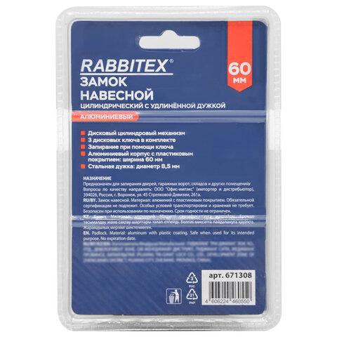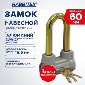 Замок навесной RABBITEX с дисковым цилиндровым механизмом секретности предназначен для запирания дверей, гаражных ворот, складов и других помещений. Достаточно прост по конструкции и надёжен в повседневной эксплуатации.Замок навесной имеет алюминиевый корпус с пластиковым покрытием и оснащен удлиненной полукруглой стальной дужкой. Тип механизма секретности – дисковый. Три дисковых ключа в комплекте. Замок запирается и открывается при помощи ключа.