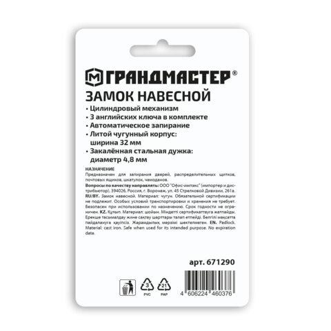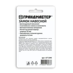 Замок навесной ГРАНДМАСТЕР с цилиндровым механизмом секретности предназначен для запирания дверей, распределительных щитков, почтовых ящиков, шкатулок, чемоданов. Достаточно прост по конструкции и надёжен в повседневной эксплуатации.Замок навесной имеет литой чугунный корпус и оснащен полукруглой дужкой из закаленной стали, что делает его прочным и увеличивает сопротивляемость к взлому. Тип механизма секретности - цилиндровый. Три английских ключа в комплекте. Замок запирается автоматически (без использования ключа) при нажатии на дужку сверху, что облегчает его эксплуатацию. Небольшие размеры замка и толщина дужки позволяют использовать его в качестве замка для чемоданов, дорожных сумок, ящиков, шкафов, почтовых ящиков и распределительных щитков.